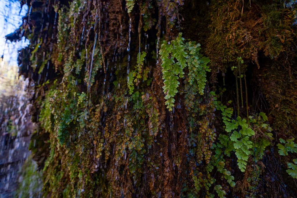 Na koniec zaglądamy jeszcze do punktu zwanego po prostu „Waterfall”, ale po zejściu po schodkach dochodzimy w zasadzie do sączącej się delikatnie wody spływającej po gęsto zarośniętej paprociami skale.