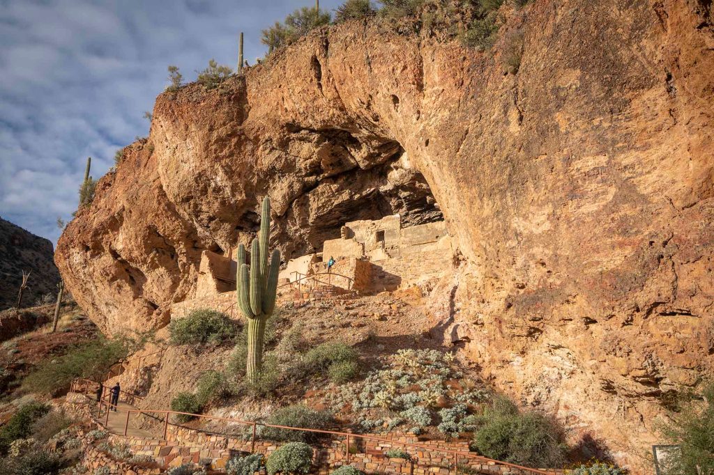 Następnie skręcamy w lewo i wjeżdżamy dość stromo pod górkę zatrzymując się na parkingu przed Visitor Center. Mamy tu do dyspozycji dwa szlaki – Dwa puebla – dolne i górne. Oba wtulone w skalne klifowe nisze. Do Upper pueblo można dostać się tylko z przewodnikiem po wcześniejszej rezerwacji. My takowej nie posiadamy, wiec pozostaje nam stromo prowadząca ścieżka do dolnego puebla – Lower Cliff Dwelling trial (długość 0.5 mili, szlak czynny od 8am do 4pm) wychodzący bezpośrednio z budynku Visitor Center. Wybetonowany chodniczek wije się pośród potężnych kaktusów saguaro nieustannie do góry doprowadzając nas do wciśniętych w klif skalny ruin pueblo.