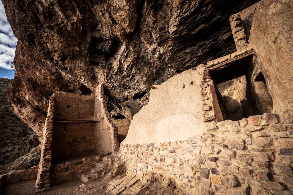 Około 1300 roku mała społeczność ludu Salado zbudowała dwa „mieszkania” w płytkich jaskiniach z widokiem właśnie na rzekę Salt, która jest obecnie jeziorem Roosevelta. Zajmowali się oni głównie garncarstwem i wytwarzaniem tkanin, które następnie były wymieniane z innymi ludami na muszelki, biżuterie czy sól. Jako myśliwi, zbieracze i rolnicy Salado w pełni wykorzystywali okoliczne zasoby pustynne. Zbierali rośliny pustynne, uprawiali bawełnę, kukurydzę, fasolę i dynie, polowali na drobną zwierzynę. Ludzie kultury Salado cieszyli się generalnie dobrym zdrowiem. Szczątki szkieletowe znalezione na tym obszarze wykazują niewiele dowodów na poważne, długotrwałe niedobory często spotykane w prehistorycznych społeczeństwach rolniczych.