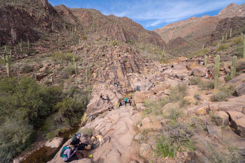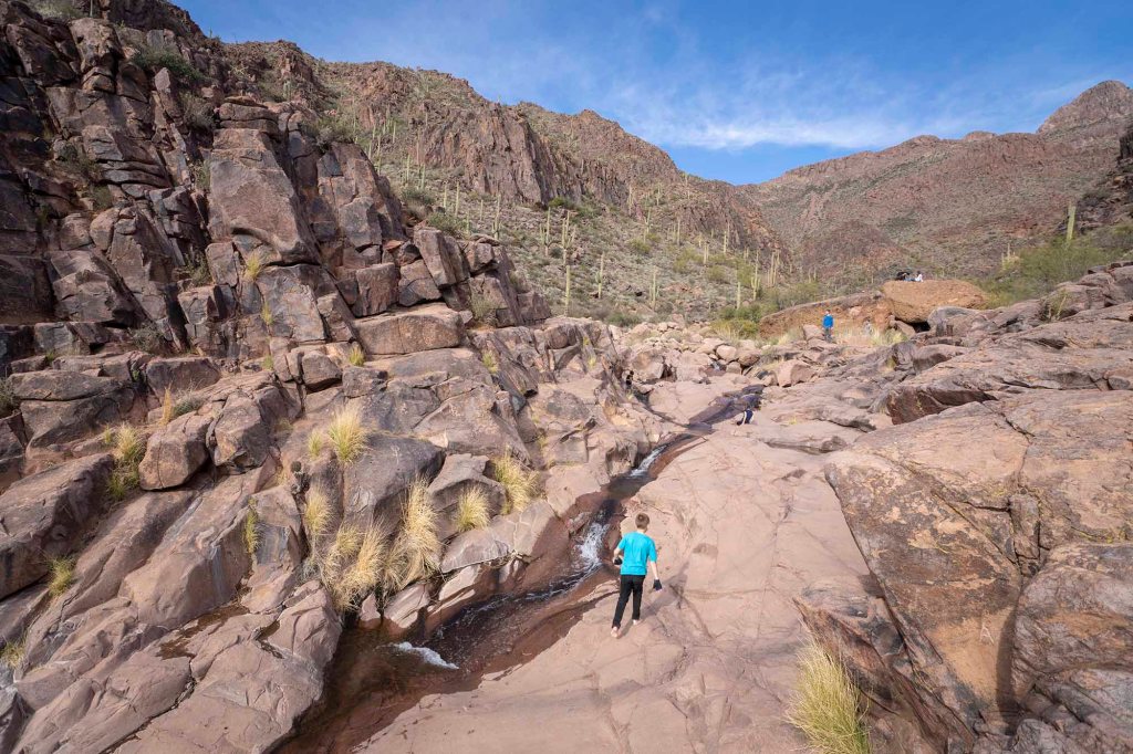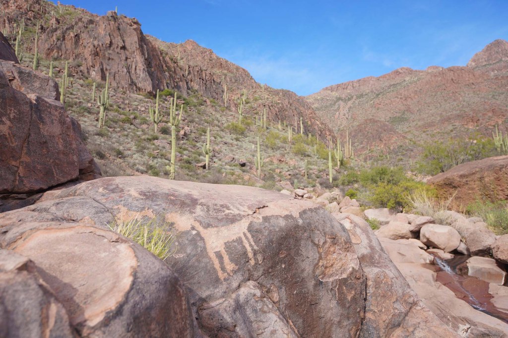 Petroglify, których jest tu naprawdę sporo zostały wykonane przez Indian Hohokam około 1,500 lat temu. Żeby się do nich dostać trzeba wspiąć się na kilka skał i przejść przez strumień. Po przyjrzeniu się im z bliska robimy sobie zasłużony odpoczynek rozkładając się na nagrzanych słońcem skałach wsłuchując w szum płynącej wody.