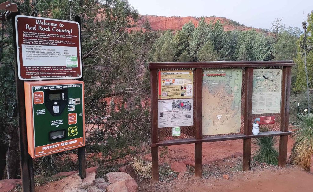 Jeszcze przed wschodem słońca docieramy do parkingu, skąd wychodzi szlak na Cathedral Rock. Parking jest płatny i jeżeli nie posiadamy National park Pass (który trzeba zostawić w widocznym miejscu w samochodzie) to musimy wykupić jednorazowy bilet ($5/auto) w znajdującym się tu automacie (na karty kredytowe i debetowe).