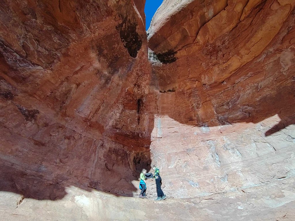 Naszym kolejnym celem jest szlak Soldier Pass (prowadzący do kilku geologicznych wspaniałości –Soldier’s arch /Devil’s Kitchen/ Seven secret pools), ale znalezienie tu parkingu o tej porze jest niemożliwe. Jest to prywatny parking czynny w godzinach 8am-6pm. Żeby się tu dostać trzeba przyjechać około godziny 7 rano i stać w kolejce zanim otworzą bramę. Mieści się tu tylko 14 samochodów. Jeśli spóźnimy się i na parking trafimy po 6pm to samochód możemy sobie odebrać dnia następnego…. Parking jest ulokowany pośród prywatnych rezydencji i wszędzie jest zakaz parkowania, także jeśli nie załapiemy się na miejscówkę na parkingu to nie mamy żadnej szansy, żeby zostawić auto w okolicy. Na alltrails znalazłam post jakieś osoby, która ogłasza się i podwozi do wyjścia na szlak, ale nie znam szczegółów. (“I am Debbie – The shuttle driver with the red Van and I am available for rides if you cannot find parking at Soldier pass trail My phone number is 928 592 2011 If you have a large group or dogs, please drop them off at the trail head and then you can park at Posse grounds park and then look for me! I pick up near the rest rooms across from the skateboard park or you can call me when you’re ready. I am back-and-forth all day long”) .