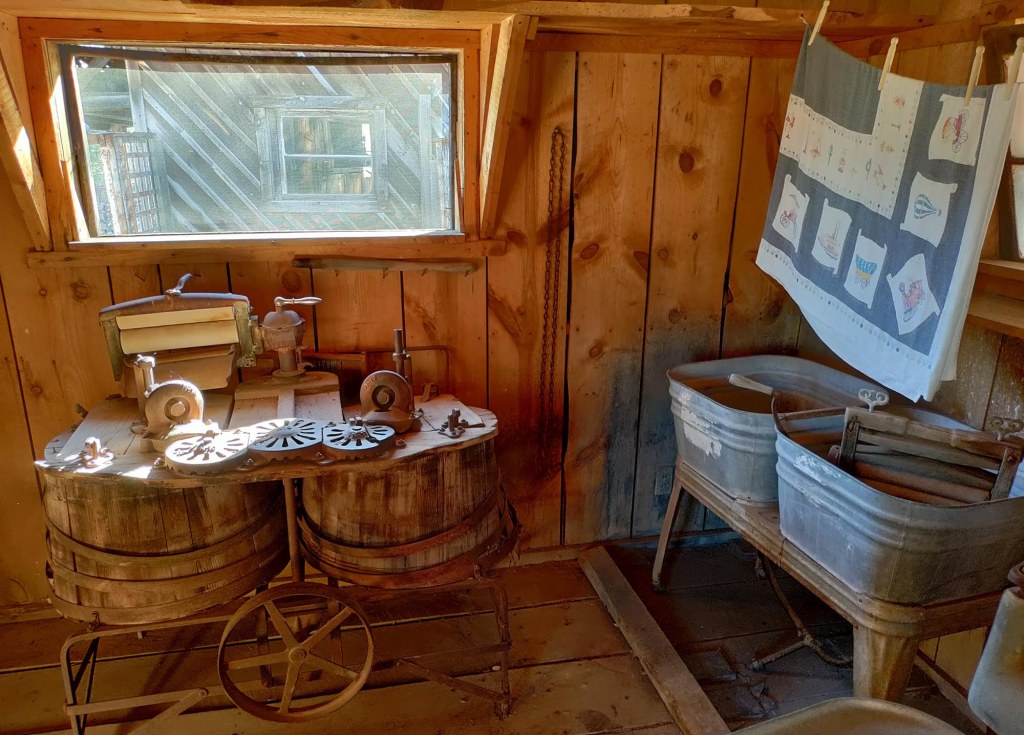 Małe drewniane rozsypujące się domki wystylizowane są na pralnie, drukarnie, sklepiki, gabinet dentystyczny itp.
