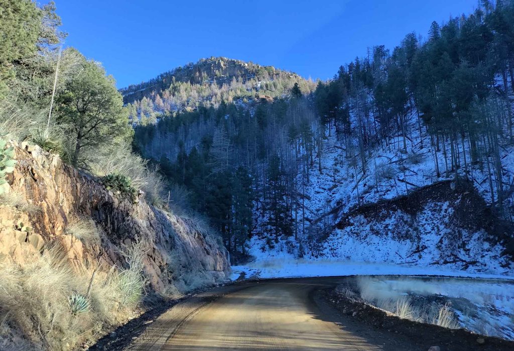 Wyjeżdżamy z parku i kierujemy się generalnie na południowy wschód przejeżdżając przez miasteczko Payson. Po przejechaniu kilku mil za miastem ruch zaczął stopniowo zwalniać aż w końcu wszystkie auta stanęły…. GPS wskazywał na 20 minutowe opóźnienie i wypadek … no i tak staliśmy sobie podjeżdżając co kilka metrów w międzyczasie. Po godzinie dowlekliśmy się do stojącego przy drodze pana drogowca który zawracał każdy samochód każdemu powtarzając te same słowa: ”Droga została zamknięta na kilka godzin”. Nie było wiadomo dlaczego…. Przed nami rozpościerały się 2 puste pasy prowadzące na południe. Jedyną informacja jaką dysponował „kierujący ruchem” pan to to, że może za 4 godziny ją otworzą … ale on nic tak naprawdę nie wie. Nie potrafił też wskazać na mapie jaki objazd można wziąć by dotrzeć do wyznaczonego przez nas docelowego miejsca. GPS nie pokazywał żadnej innej możliwości … Analizując mapę topograficzną zdecydowaliśmy się na (bardzo okrężną) szutrową drogę prowadzącą przez miasteczko Young. Droga na mapie wyglądała jakby w większości była drogą asfaltową, jak się jednak okazało najnowsza mapa Arizony (firmy Benchmark) ma jednak błędy. Jest to o tyle istotne, że w zimie droga taka może być nieodśnieżana i trochę niebezpieczna do pokonania… Nie było jednak innego rozwiązania i zdecydowaliśmy się na tą opcję z możliwością zawrócenia, jeśli taka okoliczność mogłaby wystąpić. Czekanie przez minimum 4 godziny na otwarcie drogi nie miało dla nas najmniejszego sensu. Wjazd na szutrową drogę okazał się początkowo trochę przerażający ze względu na olbrzymie pokłady śniegu zalegające w otaczającym nas lesie (wysokość około 1,900 m.n.p.m). W miarę jazdy jednak trasa okazała się wcale nie taka straszna i jakoś to wszystko szło. Z powodu licznych zakrętów i śliskiej powierzchni trzeba było jednak utrzymywać prędkość nie więcej niż 20 – 25 mil/h. Mijaliśmy bajecznie zaśnieżone polany leśne, zjeżdżając praktycznie cały czas w dół, śniegu w miarę przemieszczania się w niższe elewacje ubywało, ale błotnista nawierzchnia pozostawała praktycznie cały czas. Ruch na tej drodze był dosłownie zerowy. Jak już znaleźliśmy się w wiosce Young to naszym oczom ukazała się…. typowa dziura zabita dechami … jakieś zaniedbane domy z rupieciarniami dookoła. Minęliśmy miasteczko i automatycznie droga zaczęła się wznosić dość stromo do góry. Asfalt się skończył…. Dużo zakrętów, dużo błota, i zmiana roślinności na wysokososnową znowu.