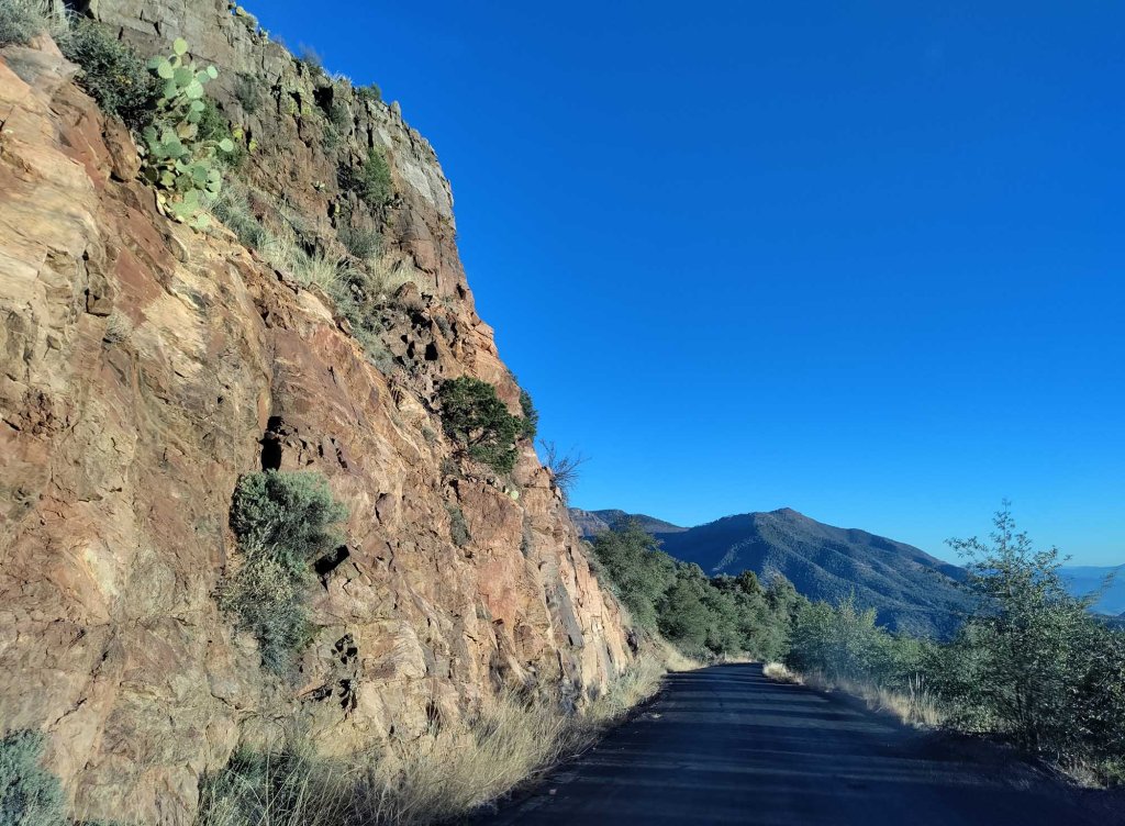 Otaczał nas cudny iglasty zielony las. Trochę mniej śniegu niż w części pierwszej naszej trasy. Kiedy pojawiały się widoki nie było za bardzo, gdzie zatrzymać, żeby zrobić zdjęcie. W tej części ruch był trochę większy i co chwilka ktoś siedział nam na ogonie. Zjechaliśmy z gór (ubłoceni po dach) i automatycznie otaczająca nas przyroda zmieniła się w typowo pustynny krajobraz z olbrzymimi kaktusami saguaro rozsianymi po wszystkich otaczających nas wzgórzach.