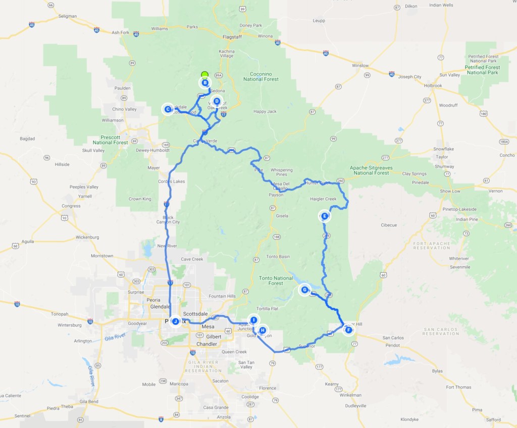 TRASA: Phoenix, Sedona (Boynton trail, Subway trail, Cathedral Rock Trail, Birthing Cave trail), Jerome (Gold Kind mine & ghost town), Sedona (Bell rock trail), Montezuma castle National Monument, Tonto Natural Bridge National Monument, Payson, Young, Road 288, Globe, Tonto National Monument (Lower Cliff trail), Theodore Roosevelt Dam, Tonto National Forest (Hieroglyphic trail), Goldfield ghost town, Phoenix.
