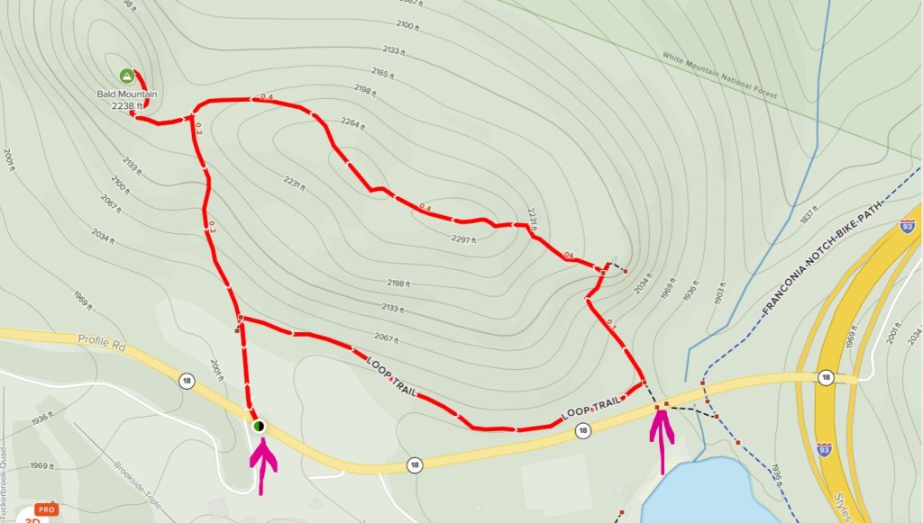 Ostani już na dzisiaj szlak – Artist Bluff prowadzący na szczyt Bald mountain (I-93 Exit 34C, off Route 18 Franconia Notch) jest krótki (długość 1,5 mili) ale bardzo stromy szczególnie w końcowej jego części. Są dwa wejścia, które doprowadzą nas do szlaku. To bardziej wysunięte na zachód znajduje się na olbrzymim parkingu (należącym do Cannon mountain sky resort).