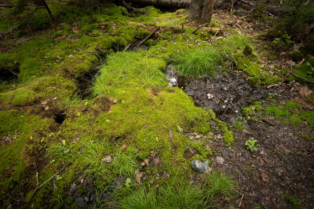 Szlak prowadzi nas „ósemką” po soczysto zielonym lesie, którego w podszyciu dominują paprocie i mchy.