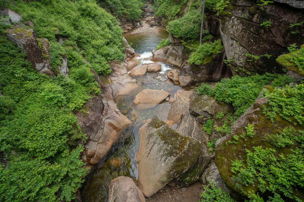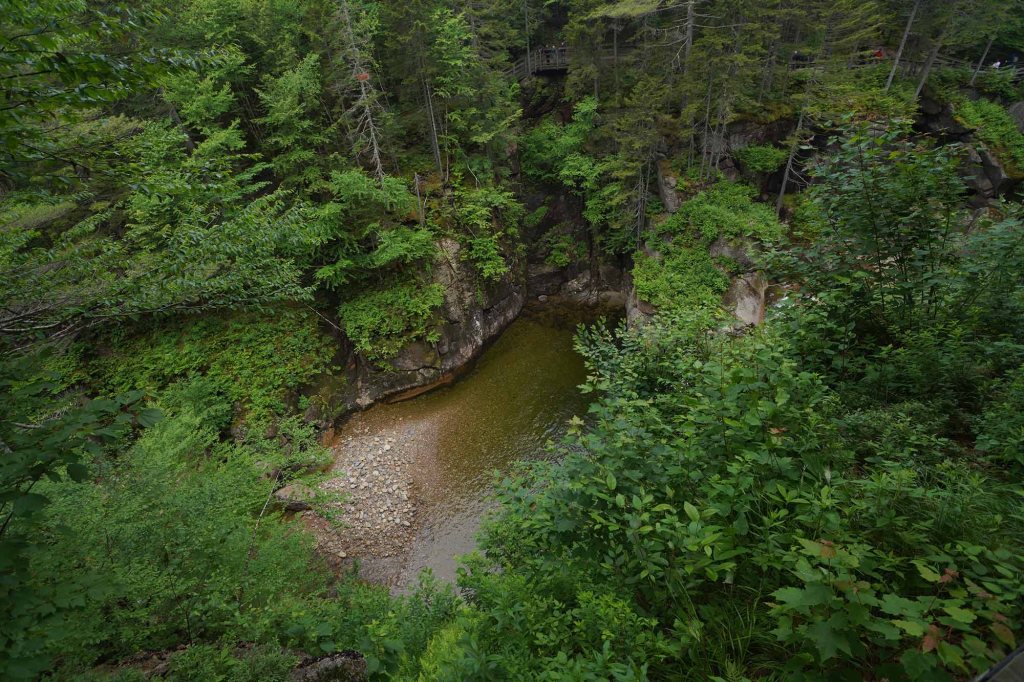Następnie wchodzimy po schodkach na drewniany pomost, który prowadzi nas wąskim granitowym kanionem (o długości 250 metrów) dalej w górę rzeki ……