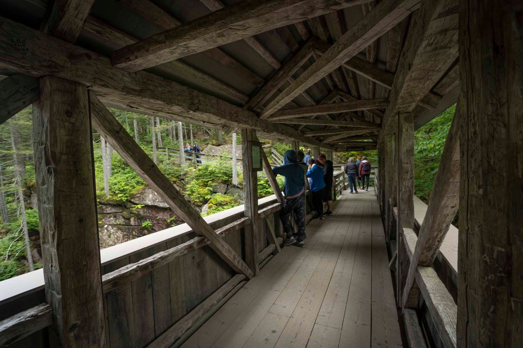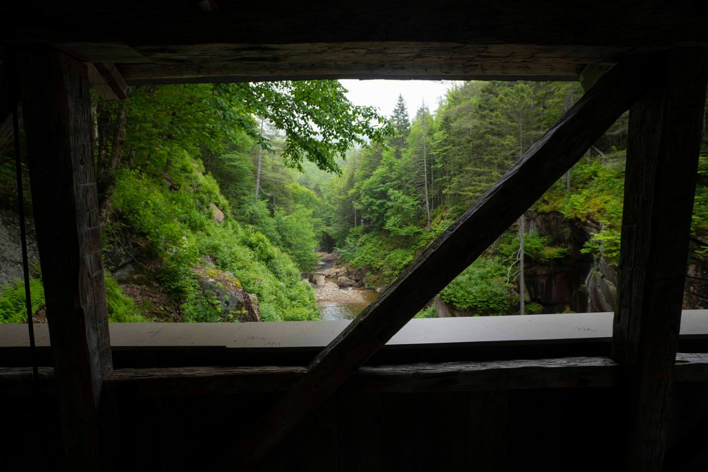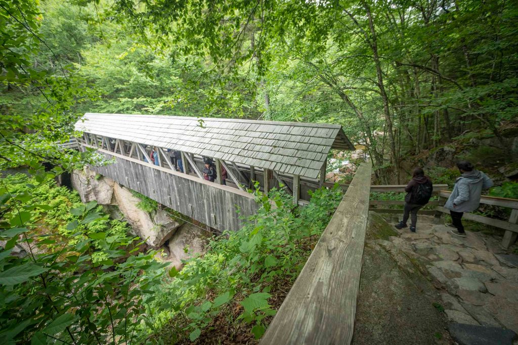 Następnie szlak prowadzi przez Sentinel Pine Covered Bridge, z którego można podziwiać wspaniały widok na rzekę Pemigewasset.