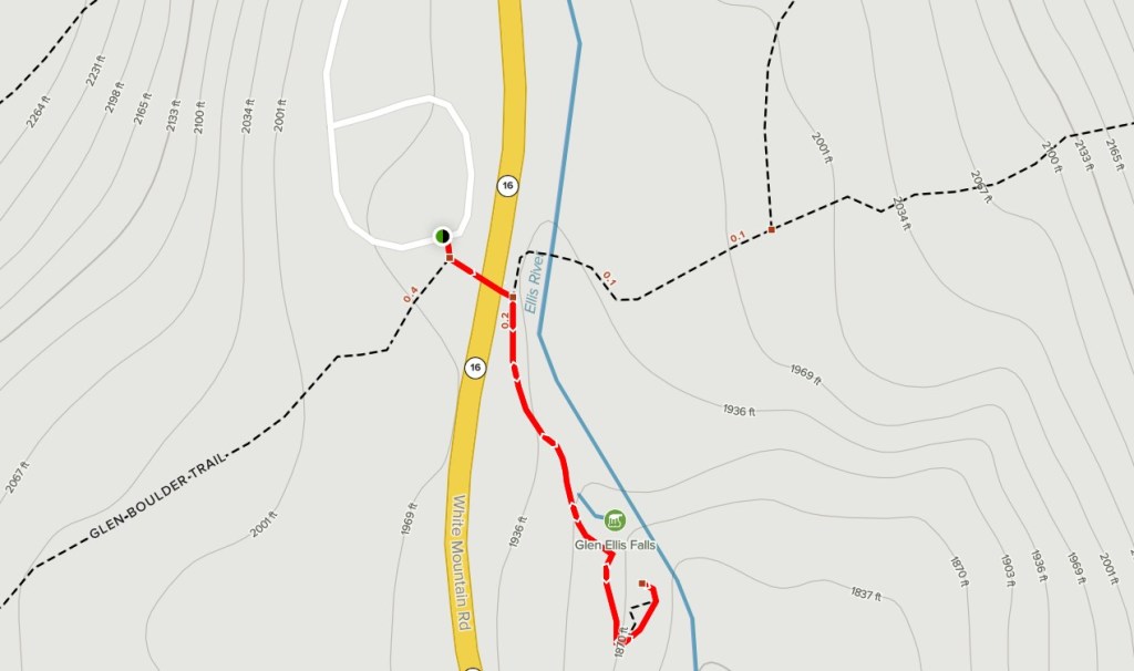 Z North Conway wyjeżdżamy na północ drogą numer 16. Przejeżdżamy obok krytego mostu Honeymoon covered bridge i docieramy do parkingu, skąd wychodzi szlak GLEN ELLIS Falls (długość 0.5 mili).