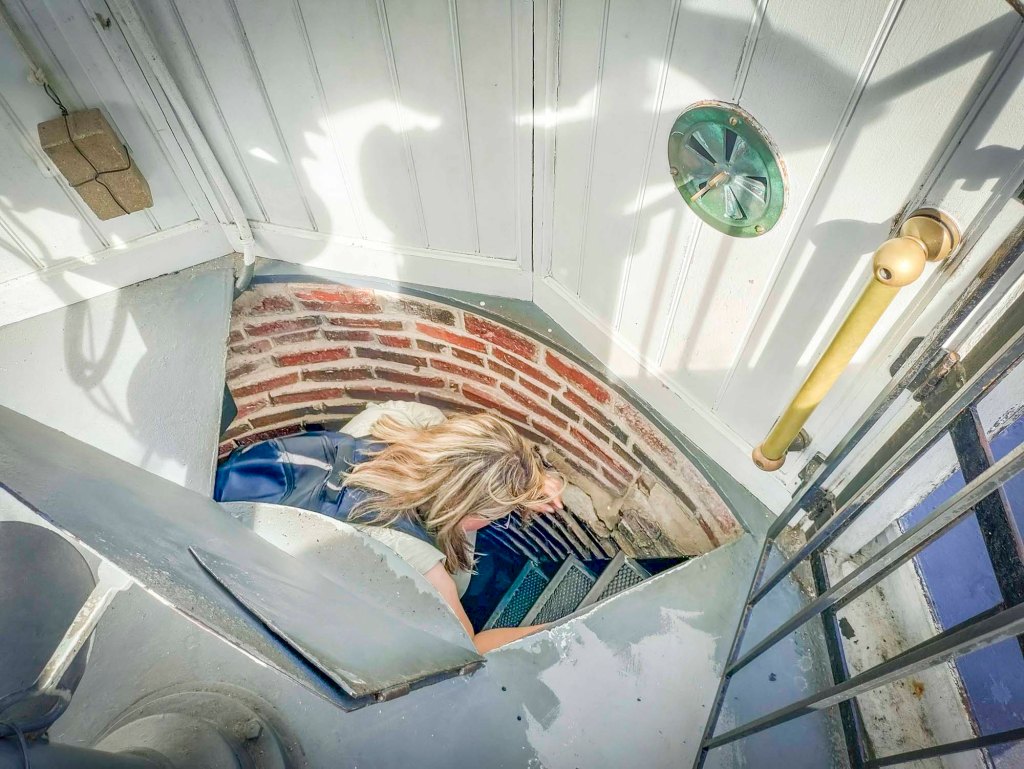 Na dwunastometrową latarnię można wejść po bardzo wąskich metalowych schodkach. Na górze mieszczą się maksymalnie 3 osoby dorosłe.