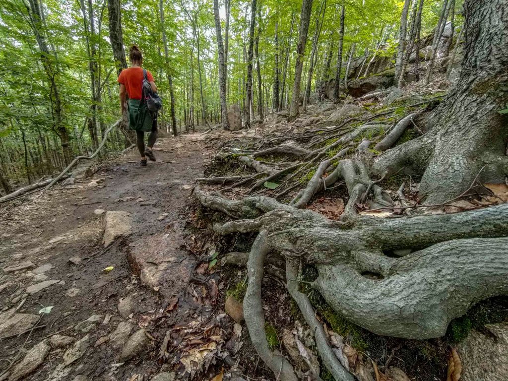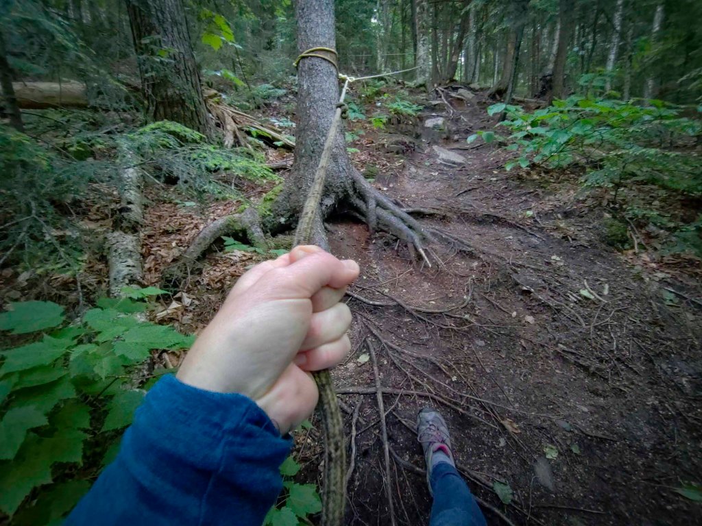 Dobrym pomysłem są tu przymocowane do drzew liny, które bezpiecznie pomagają pokonać strome nachylenie terenu w środkowej części szlaku.