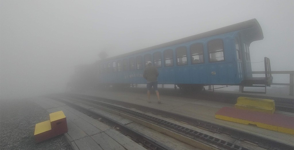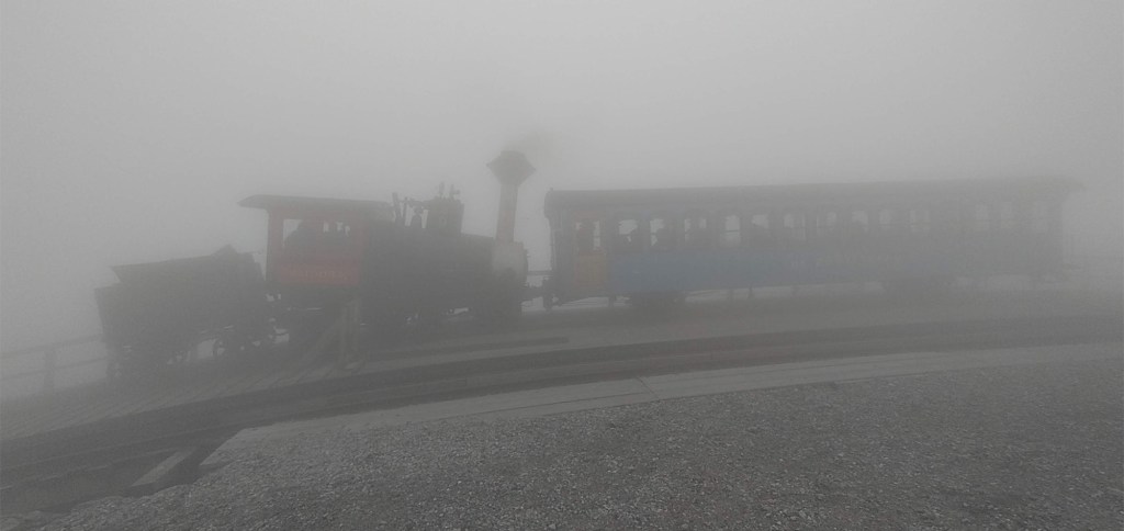 Na górę Washington wjechała właśnie kolejka Cog Railway…. którą ledwo dostrzegamy w gęstej mgle.