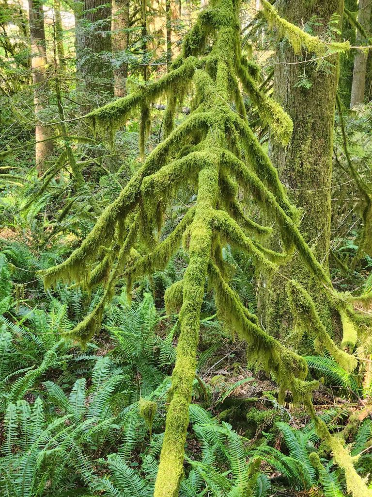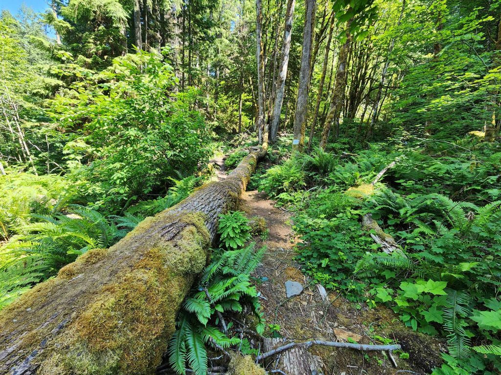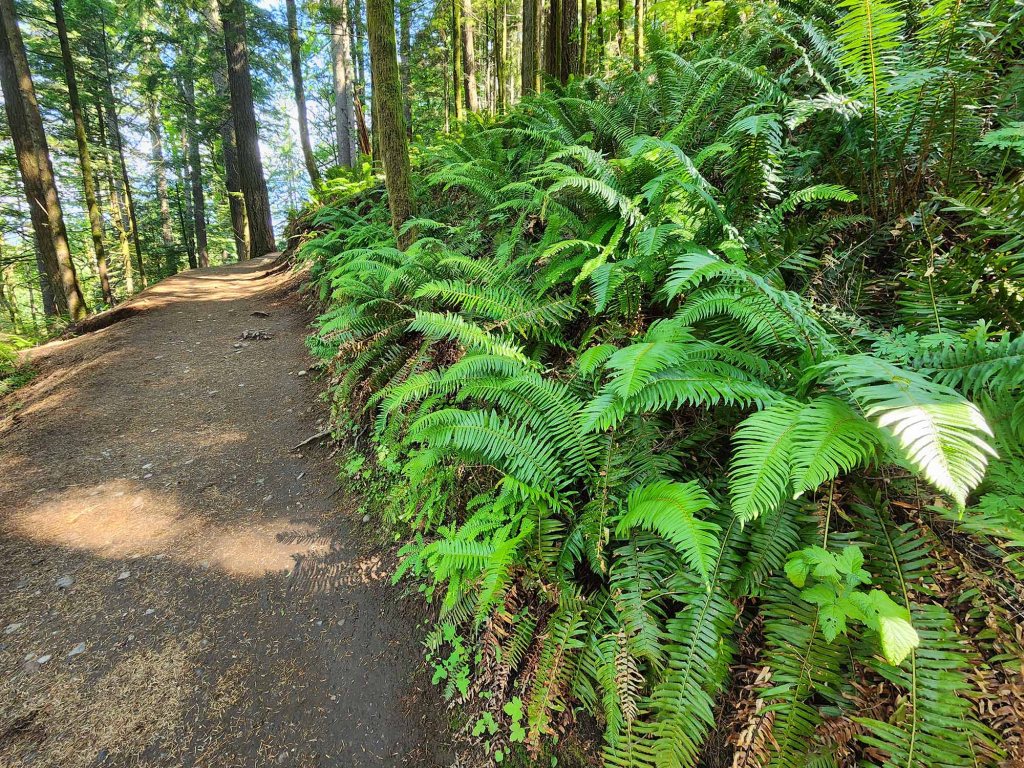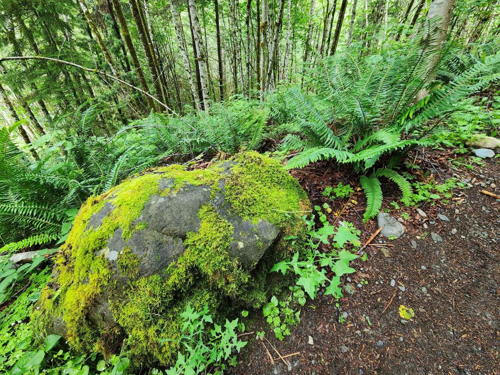 Paprocie i omszone pnie drzew, sporej wielkości głazy narzutowe, szlak jest szeroki i dobrze utrzymalny aż do miejsca Lower View.