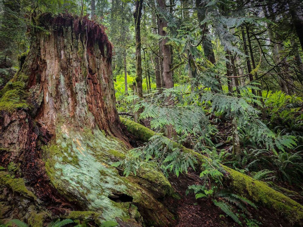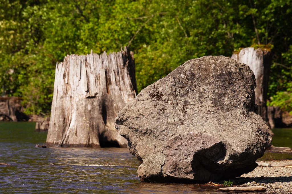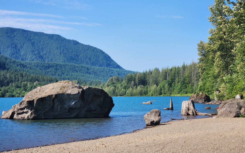 Rattlesnake lake słynie z dość niespotykanego widoku – pełno tu wystających starych olbrzymich cedrowych konarów drzew zatopionych w wodzie…….