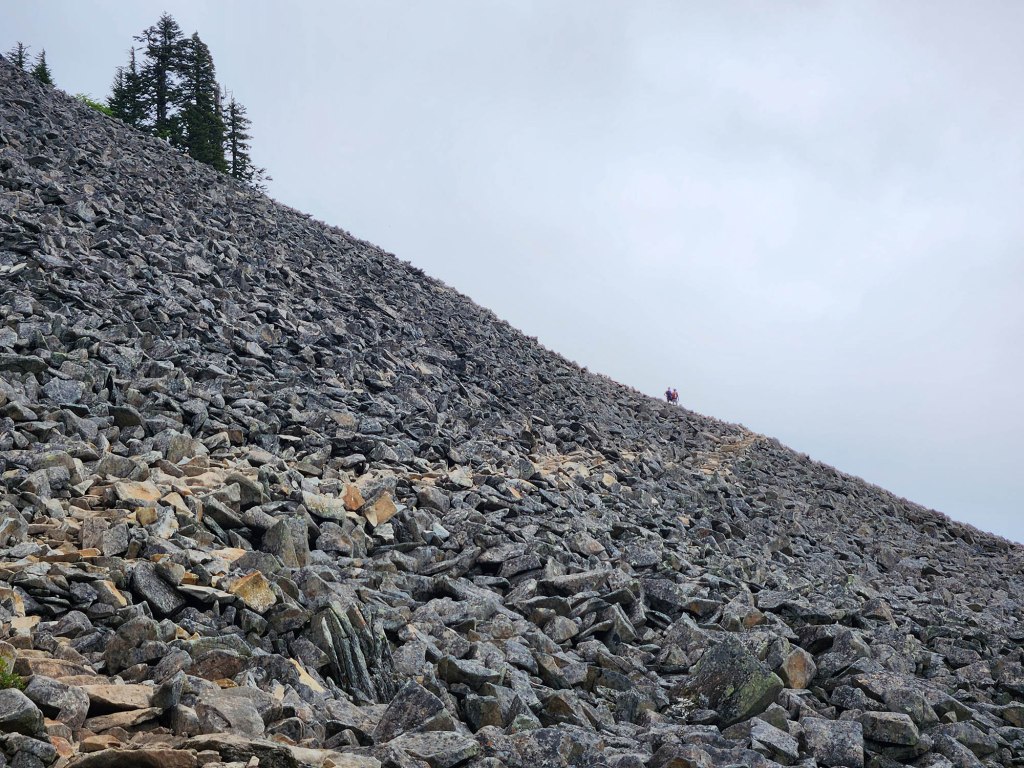 …wielkie rumowiska skalne po których trzeba się wspiąć dosyć stromo… i kiedy już jestem pewna, że szczyt jest za przysłowiowym rogiem… zaczynają się prawdziwe schody …. wielkie kroki po wielkich kamieniach, (przydaje się kijek hikingowy)……
