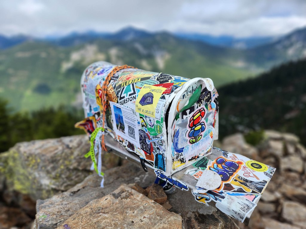 Na samym szczycie ustawiono skrzynkę pocztową, która jest pozalepiana róznymi kolorowymi naklejkami…,