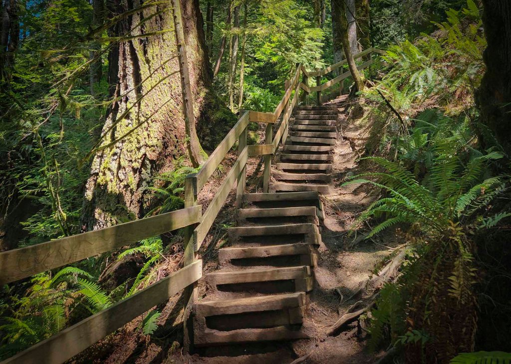 Następnie zygzakami stromo pod górkę i dochodzi się do drewnianych schodków prowadzących w dół do platformy widokowej na Lower Twin Falls.