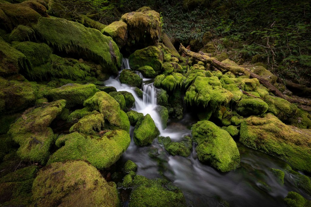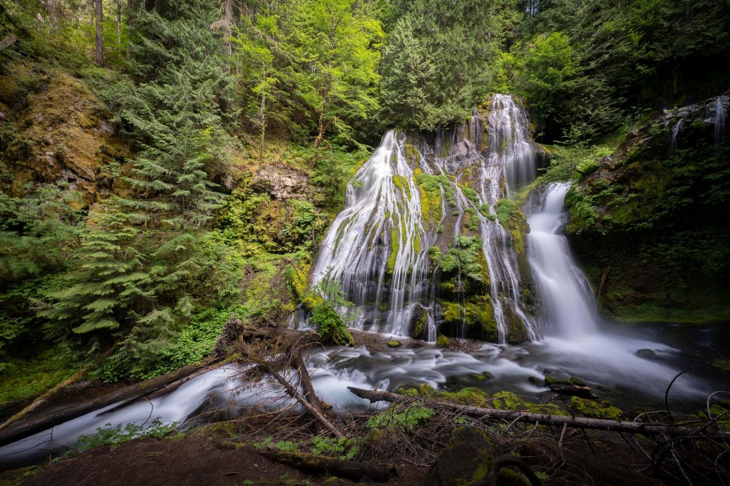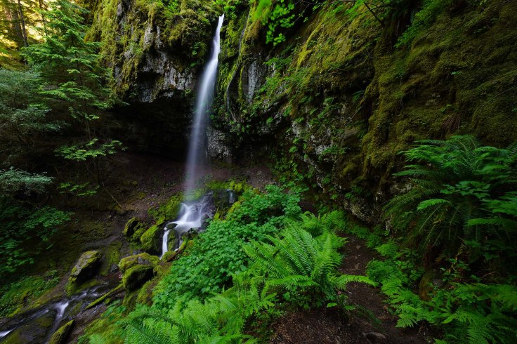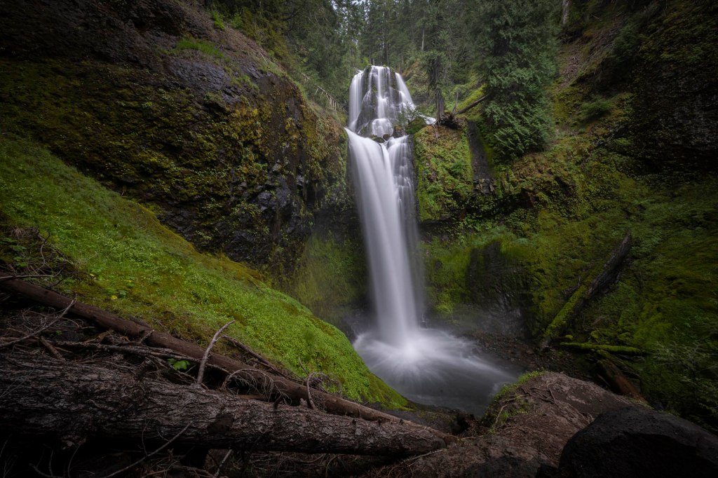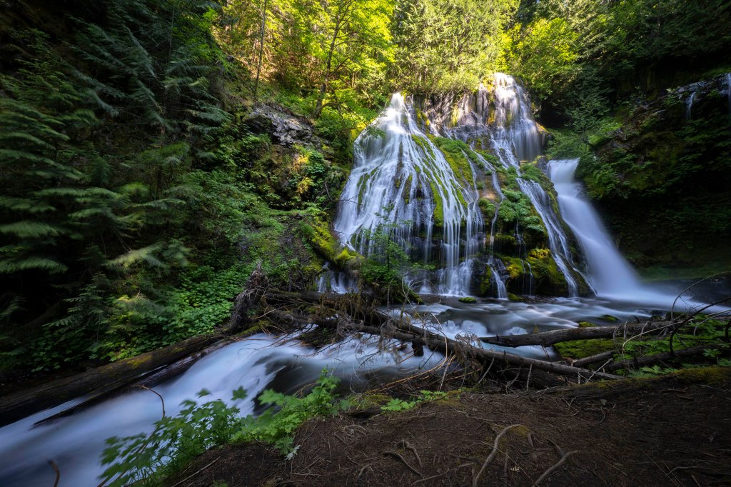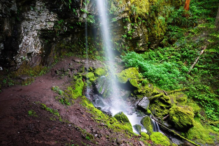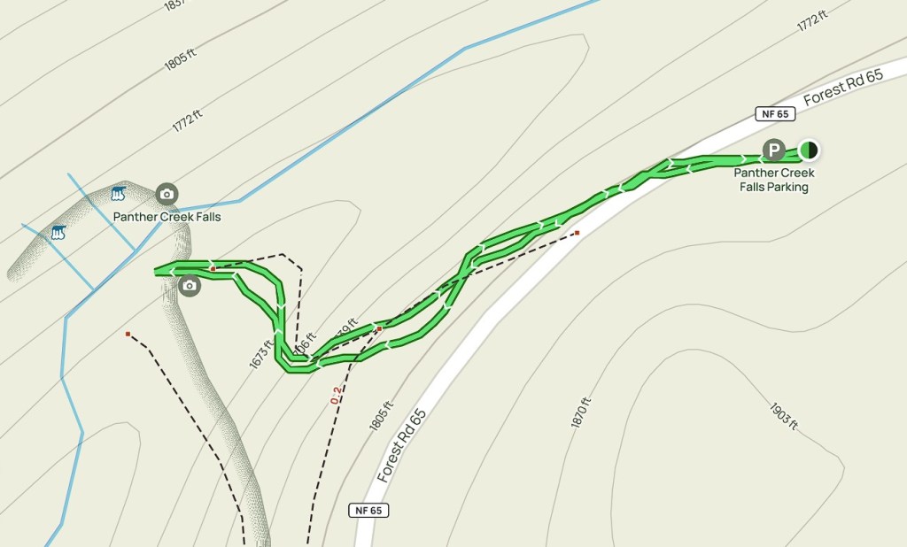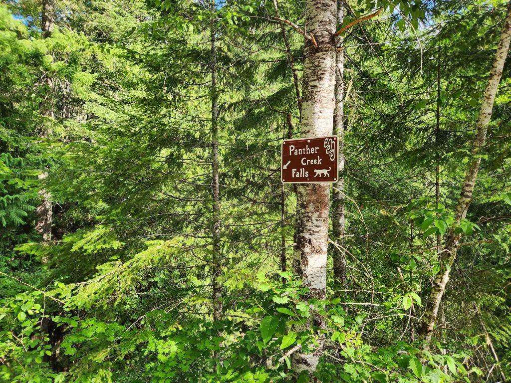 Kolejny szlak to Panther Creek Falls (wysokość 40 metrów) – jeden z moich ulubionych wodospadów w stanie Washington. Dojazd do wyjścia na szlak jest stosunkowo prosty. Z miasteczka Carson drogą Wind River Hwy jadę na północ, po czym skręcam w drogę NF-65. Parking znajduje się znacznie wcześniej niż pokazuje GPS. Po prawej stronie drogi jest spory szutrowy parking (nie ma tu żadnej tablicy informacyjnej).