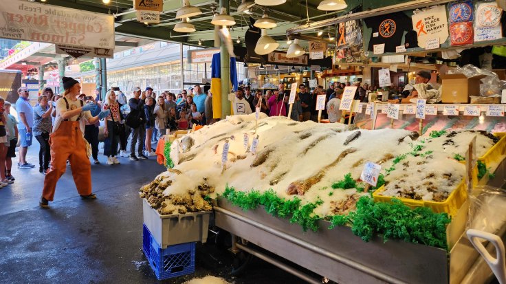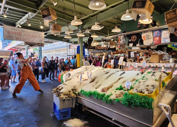 Jedną z głównych atrakcji targu jest dział rybny, na którym pracownicy rzucają sobie nawzajem wielkie łososie, zamiast podawać je sobie ręcznie. Kiedy klient zamawia rybę, pracownik przy pokrytym lodem stole rybnym na targu rybnym podnosi rybę i rzuca ją na blat, gdzie inny pracownik łapie ją i przygotowuje do sprzedaży.