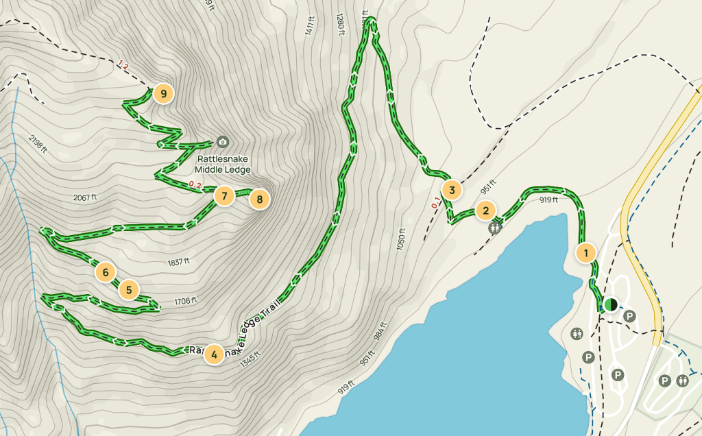 Serpentyny ciągną się przez około 4 mile, po czym ponownie dołączają do starego szlaku na wysokości 1,177 m n.p.m. (szczyt położony jest na wysokości 1,470 m n.p.m)