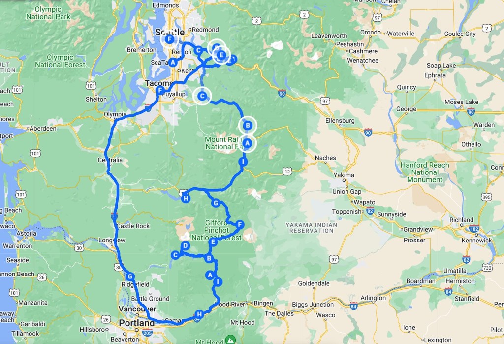 TRASA: Seattle, Mount Baker Snoqualmie National Forest: Mailbox Peak trail, Rattlesnake Ledge Trail, Ollalie State Park: Twin Falls trail, Tacoma: CHIHULLY Glass Museum, Beacon Rock trail, Gifford Pinchot national Forest: Panther Creek Trail, Lower Fall creek falls trail, McClellan viewpoint, Mount Saint Helens National Volcanic Monument: Mount Saint Helens via Worm Flows trail, Gifford Pinchot national Forest: Lewis River falls trail, Takhlakh lake, Covell creek falls and Angel Falls trail; Mount Rainier National Park: Silver falls trail, Tipsoo lake; Mount Baker Snoqualmie National Forest: Goat falls trail, Snoquera falls, Snoqualmie falls; North Bend, Seattle: Kerry Park, Chihuly Garden and Glass museum, Amazon The Spheres, Pike Place Market, Ferry to Bainbridge, Olympic Sculpture Park)