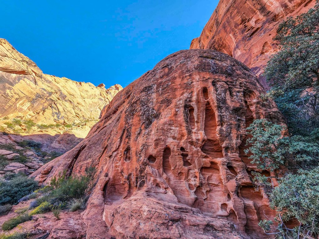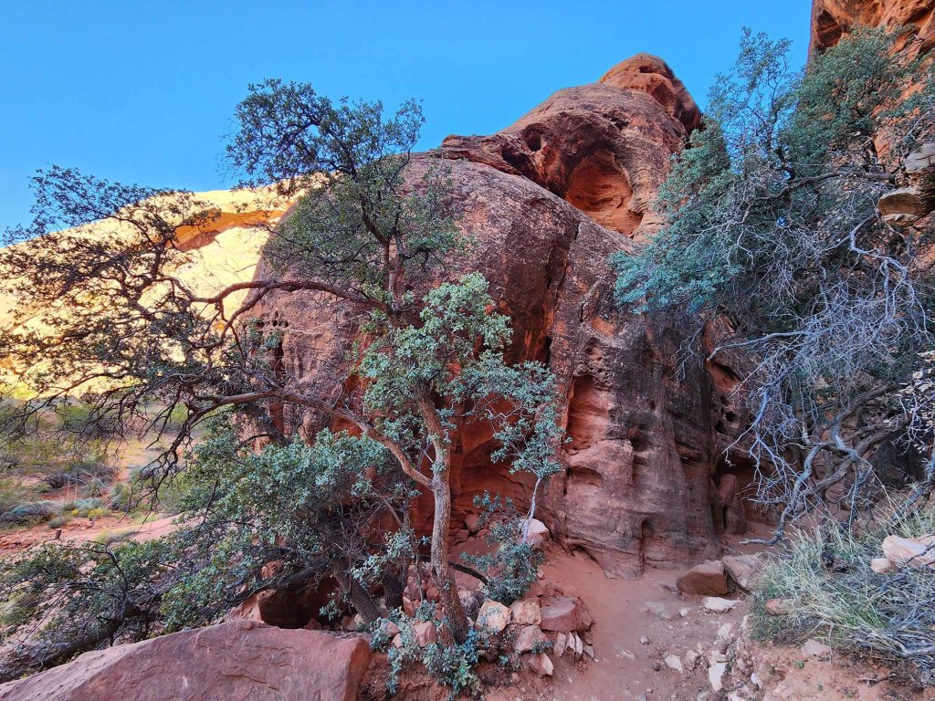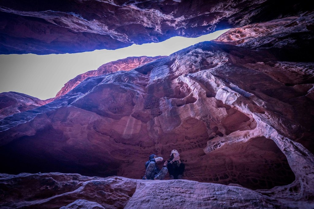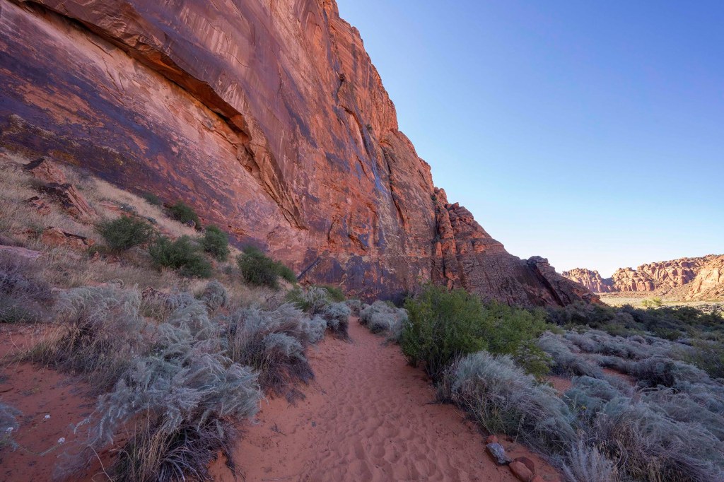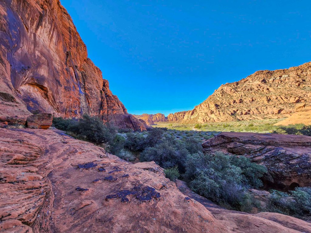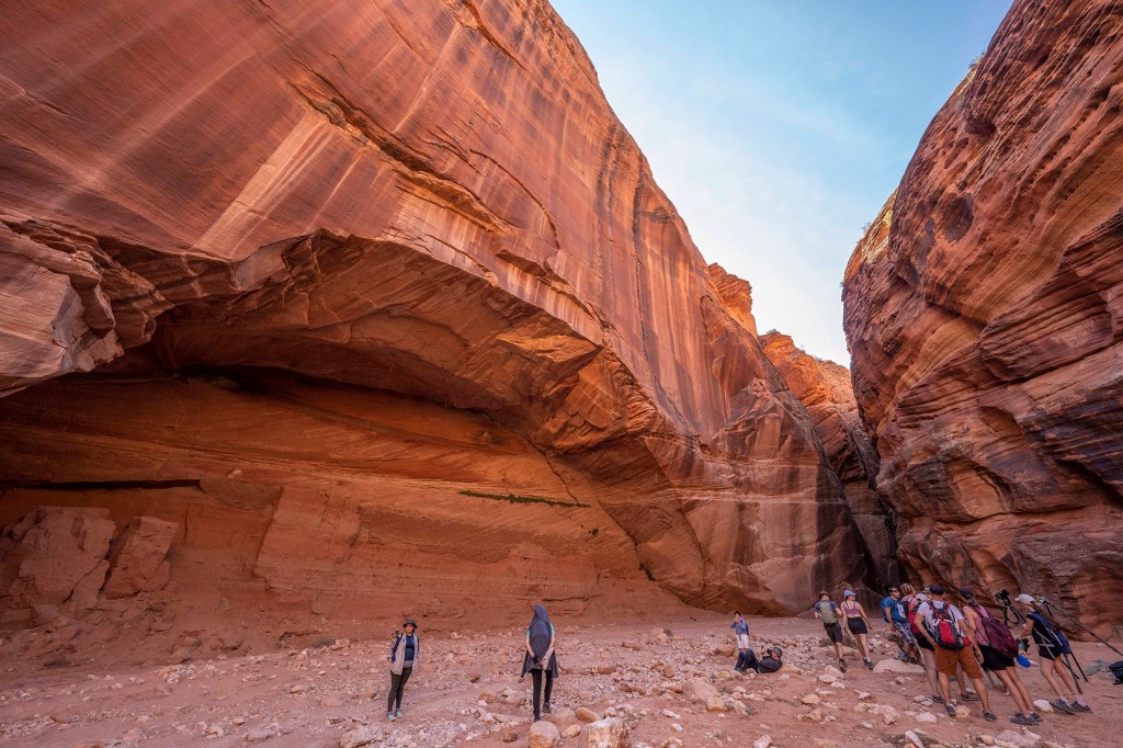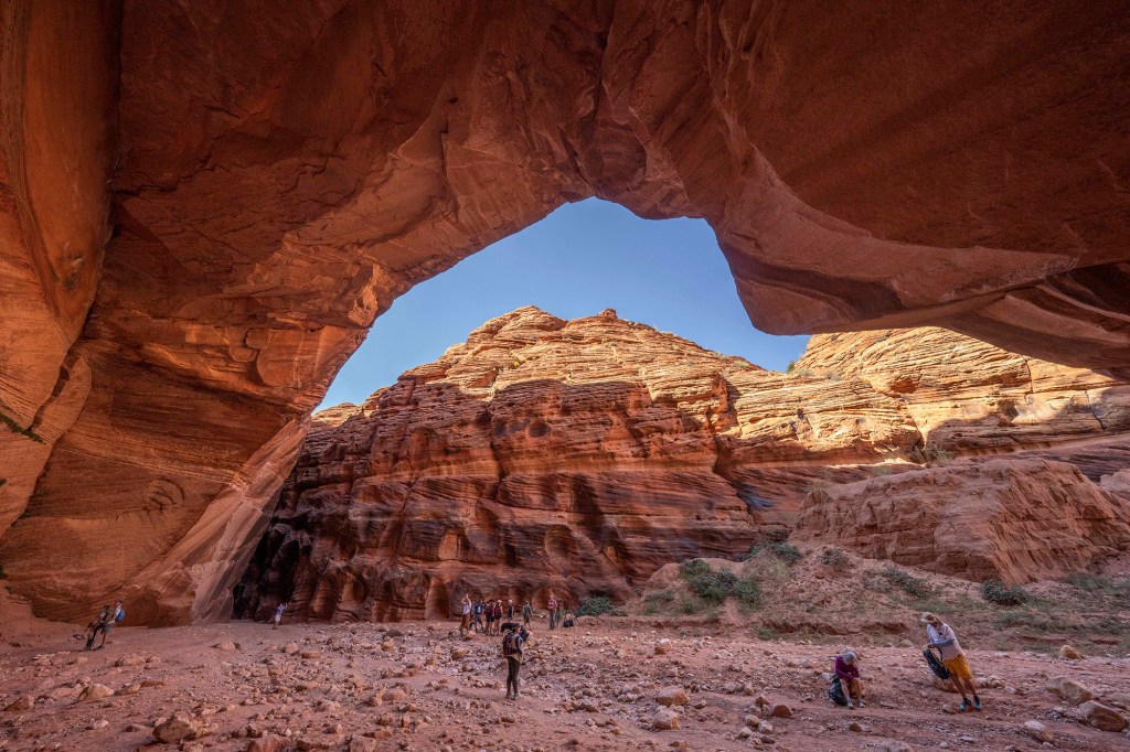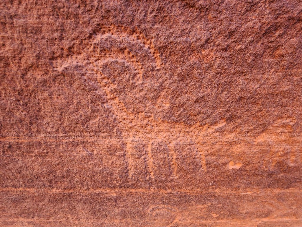 Po spacerze tak wąskim kanionem ogrom tego „otwarcia” zapiera dech w piersiach! Poranne światło nadaje wielkiej pionowej skale jasny pomarańczowy kolor… niesamowity widok! Dodatkową atrakcją są petroglify wyryte na ścianach (po północnej stronie).