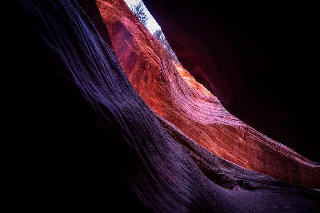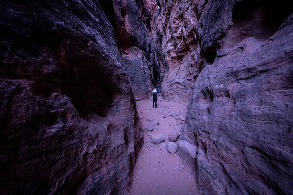 Na końcu kanionu znajduje się bardzo wąskie zwężenie i wkraczamy w ciemną przestrzeń pod dużą zwisającą skałą.
