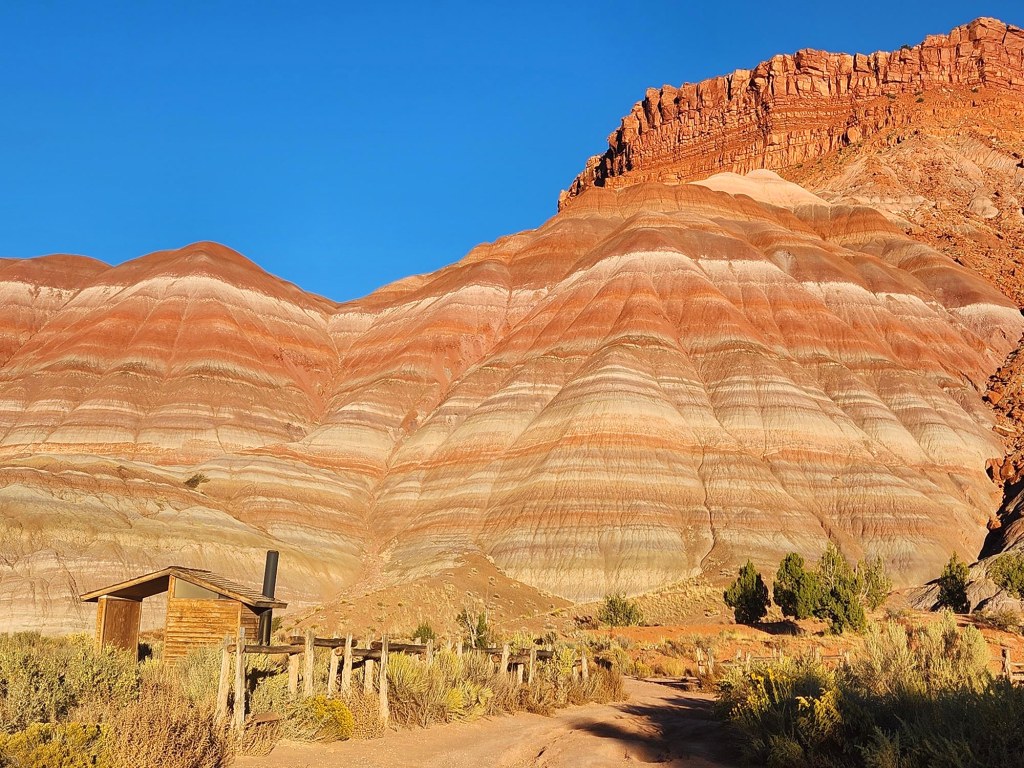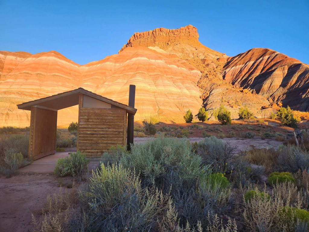 Po przejechaniu około ponad 5 mil, urozmaiconych cudownymi widokami Vermillion Cliffs, docieramy do niewielkiego parkingu (chyba z najpiękniej położonym WC na świecie), gdzie kiedyś znajdowało się plan zdjęciowy” Paria Movie Set”.