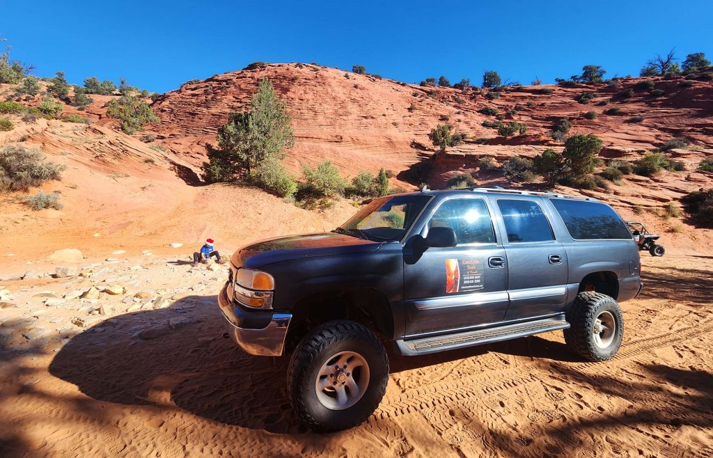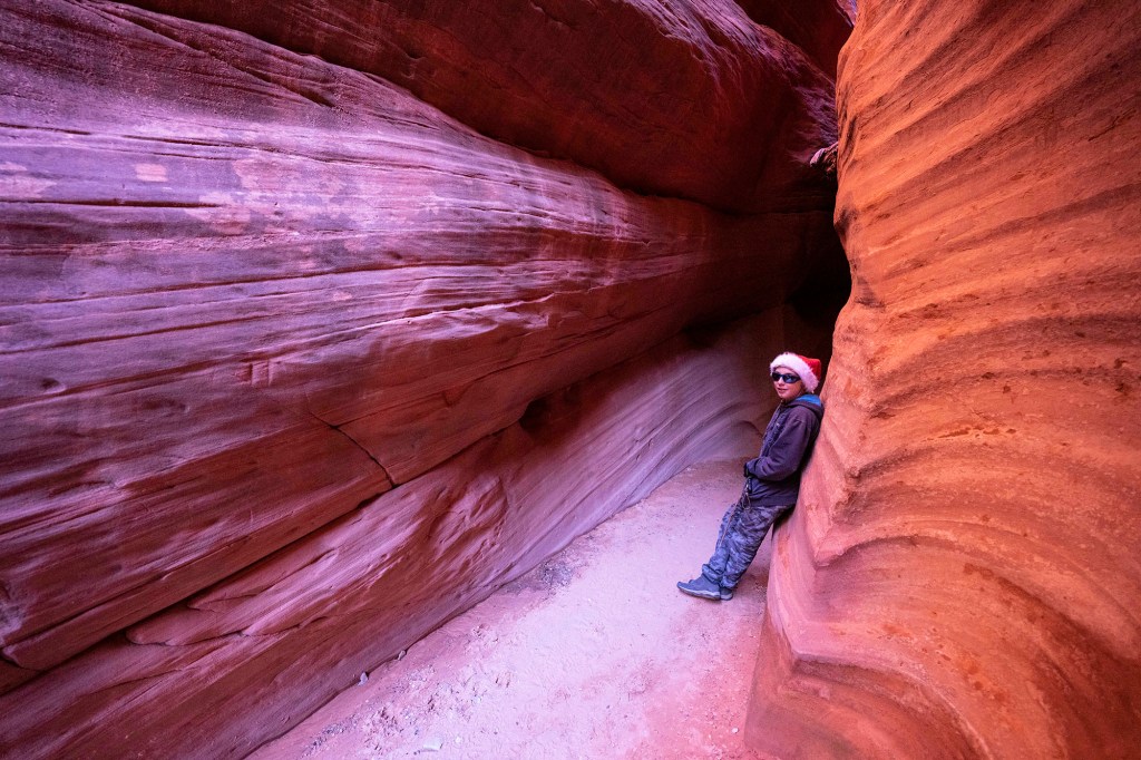 Dzień zaczynamy od (wykupionej) wycieczki do kanionu szczelinowego – Peek-a-boo canyon. (Coral Cliffs Tours of Kanab oferowało najniższą cenę za 2,5 godzinną wycieczkę – $70/osoba). Wejście do kanionu jest bezpłatne, ale dojazd do niego wymaga niestety auta z napędem 4×4.
