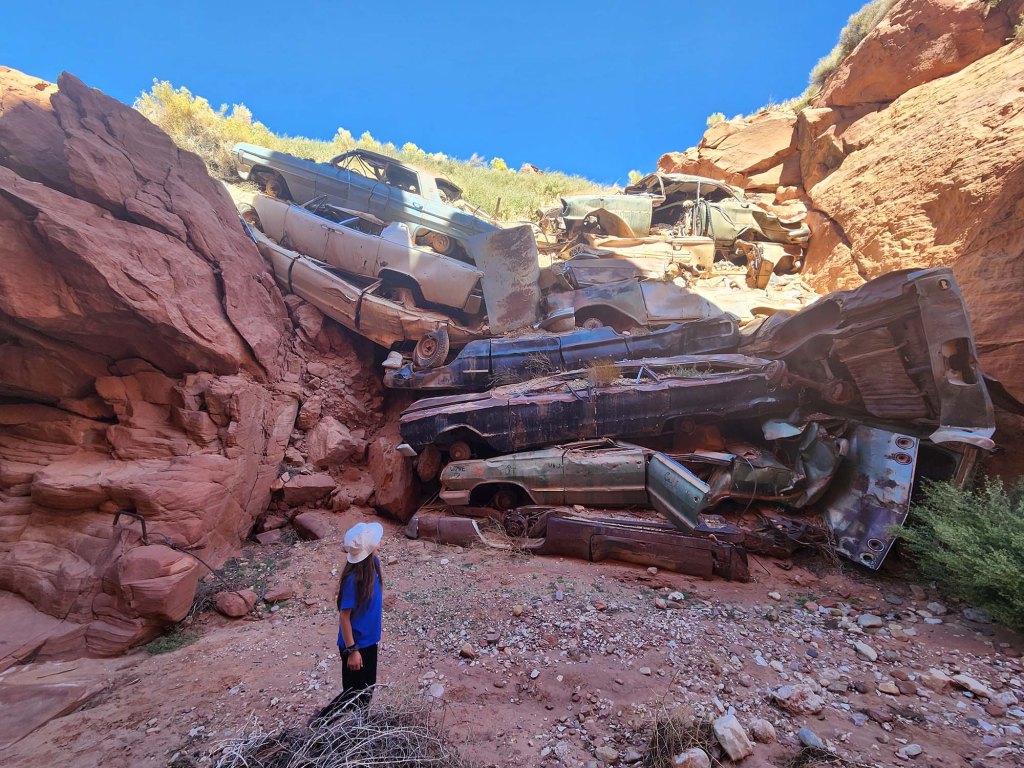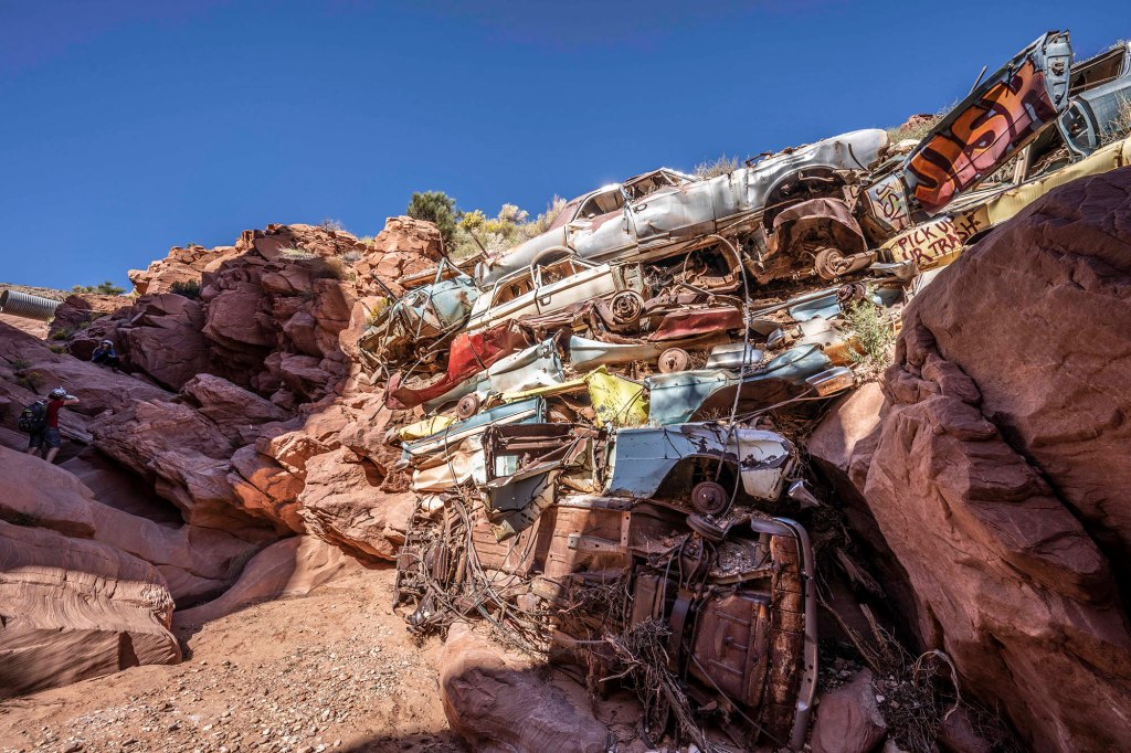 Dochodzimy do „wieży” ułożonej ze starych wraków samochodów.