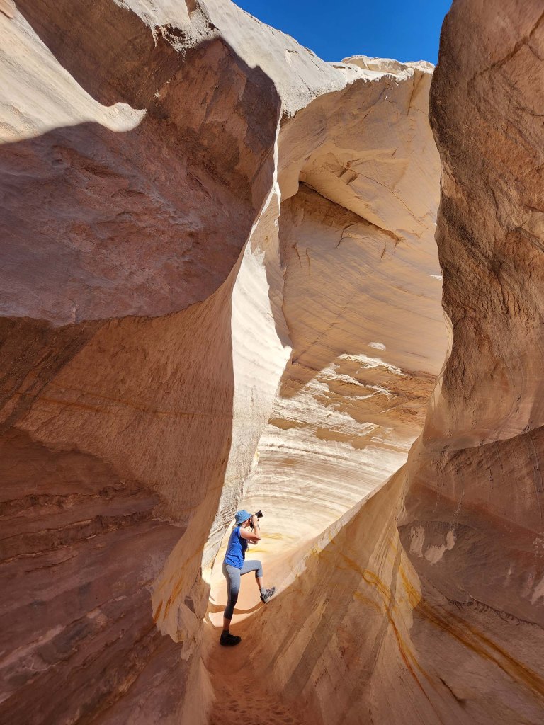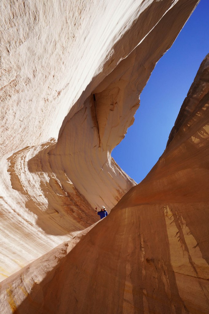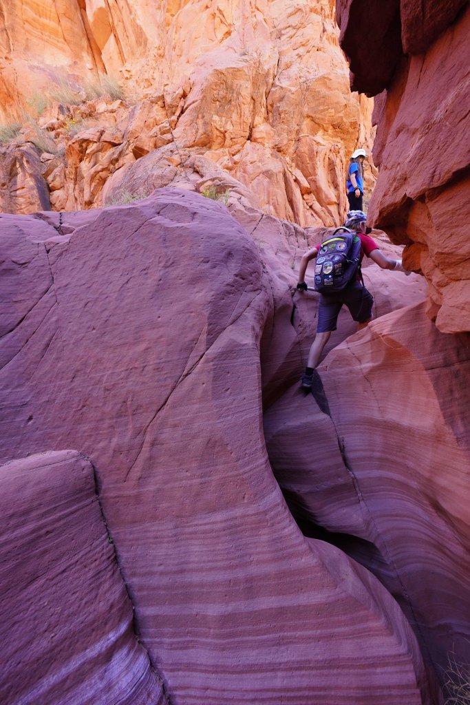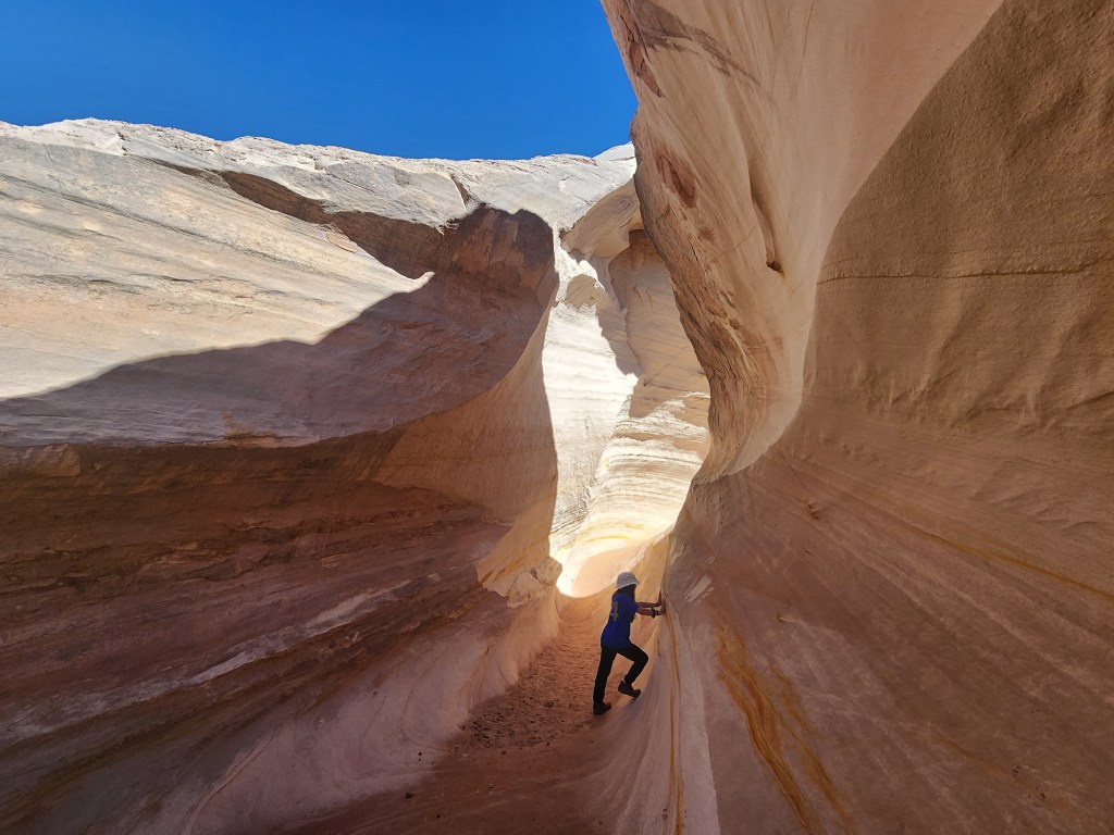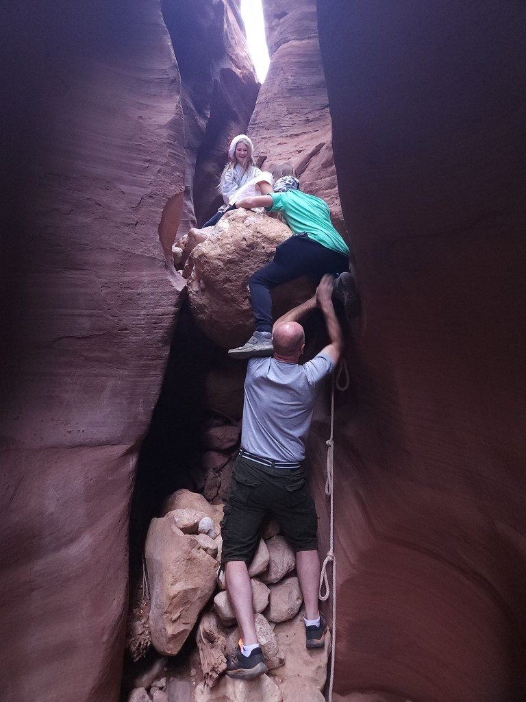 Niestety trochę się tu zmieniło od 2016 roku, kiedy wędrowaliśmy tym szlakiem ostatni raz. Sześć lat temu bez większego problemu można było pokonać około 3 metrowe przewyższenie w kanionie, bo w jego dolym odcinku leżało mnóstwo wielkich kamieni ułożonych na stercie. Teraz pomimo liny przytwierdzonej zresztą niezbyt solidnie do podłoża, okazało się to zbyt ryzykowne. Drabina, która była zainstalowana tutaj jakiś czas temu, też została usunięta najprawdopodobniej przez ostatnia powódź. Wracamy więc z powrotem do wejścia do kanionu i wspinamy się wyznaczonym „bypassem” do góry i następnie stromo w dół. (Dobre buty hikingowe bardzo przydatne). I dalej już bezproblemowo suniemy wąskim korytarzem w kierunku Buckskin Gulch.