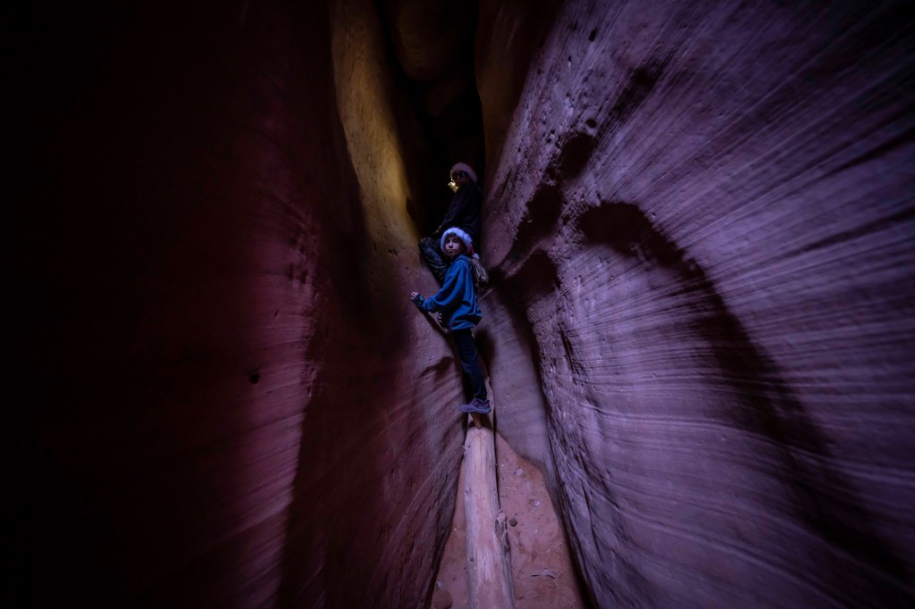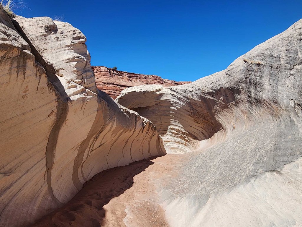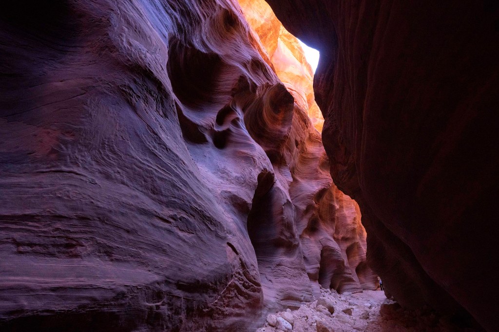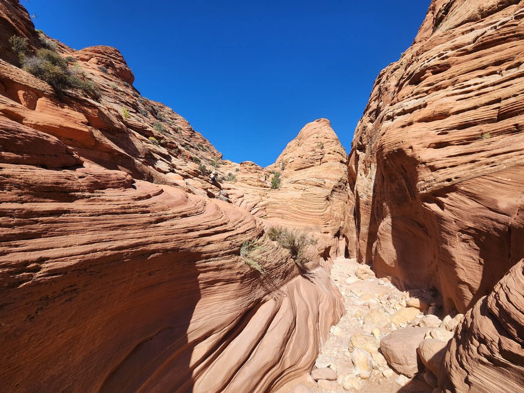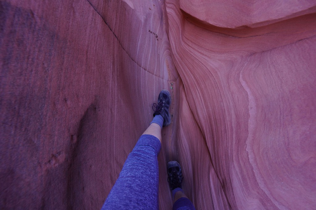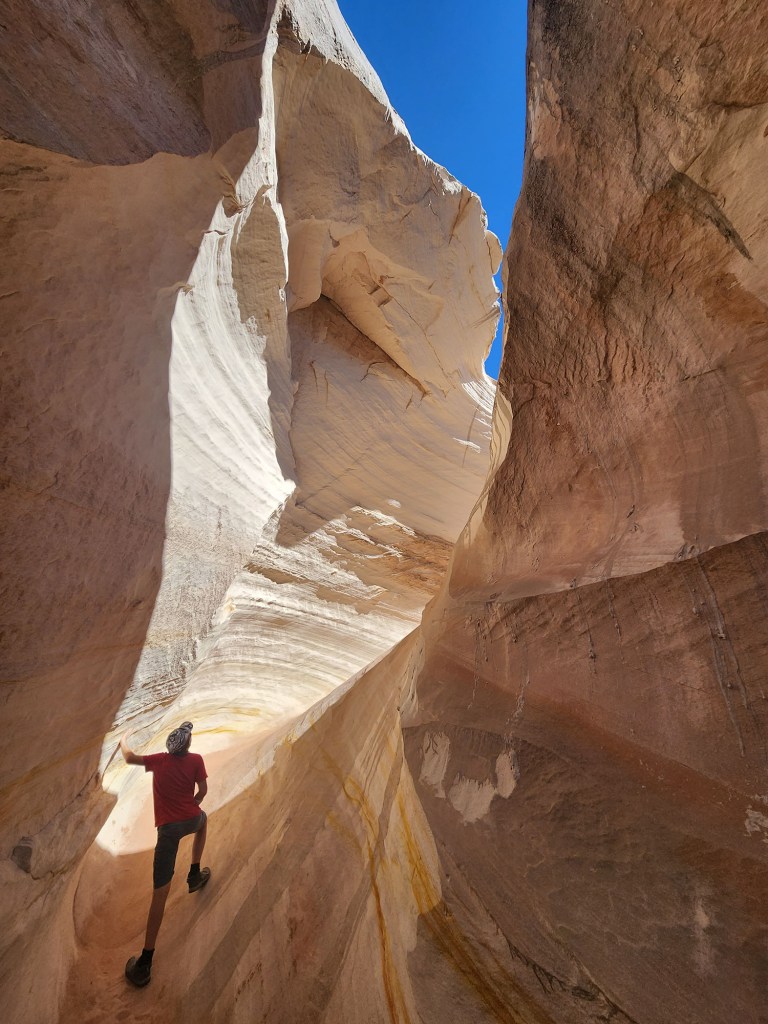 Niestety trochę się tu zmieniło od 2016 roku, kiedy wędrowaliśmy tym szlakiem ostatni raz. Sześć lat temu bez większego problemu można było pokonać około 3 metrowe przewyższenie w kanionie, bo w jego dolym odcinku leżało mnóstwo wielkich kamieni ułożonych na stercie. Teraz pomimo liny przytwierdzonej zresztą niezbyt solidnie do podłoża, okazało się to zbyt ryzykowne. Drabina, która była zainstalowana tutaj jakiś czas temu, też została usunięta najprawdopodobniej przez ostatnia powódź. Wracamy więc z powrotem do wejścia do kanionu i wspinamy się wyznaczonym „bypassem” do góry i następnie stromo w dół. (Dobre buty hikingowe bardzo przydatne). I dalej już bezproblemowo suniemy wąskim korytarzem w kierunku Buckskin Gulch.