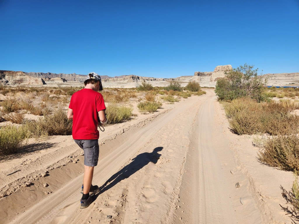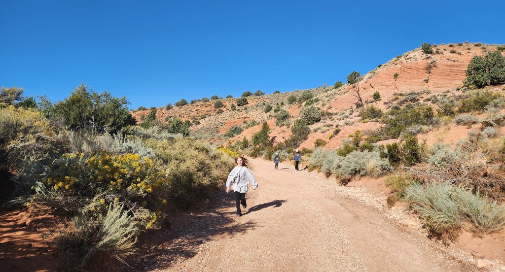 Wracamy do auta tą samą drogą, wędrując wyschniętym, korytem rzecznym i jedziemy dalej na wschód w kierunku Page. Skręcamy w szutrową drogą White House trailhead road #751 na południe (mijając po prawej Paria Contact Station) – i po przejechaniu 1.6 mili parkujemy w małej zatoczce po prawej stronie drogi. Nie ma tu żadnych oznaczeń dotyczących szlaku Nautilus.