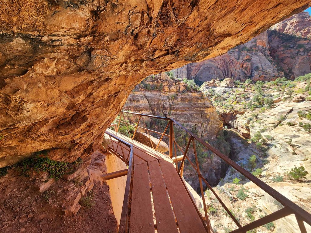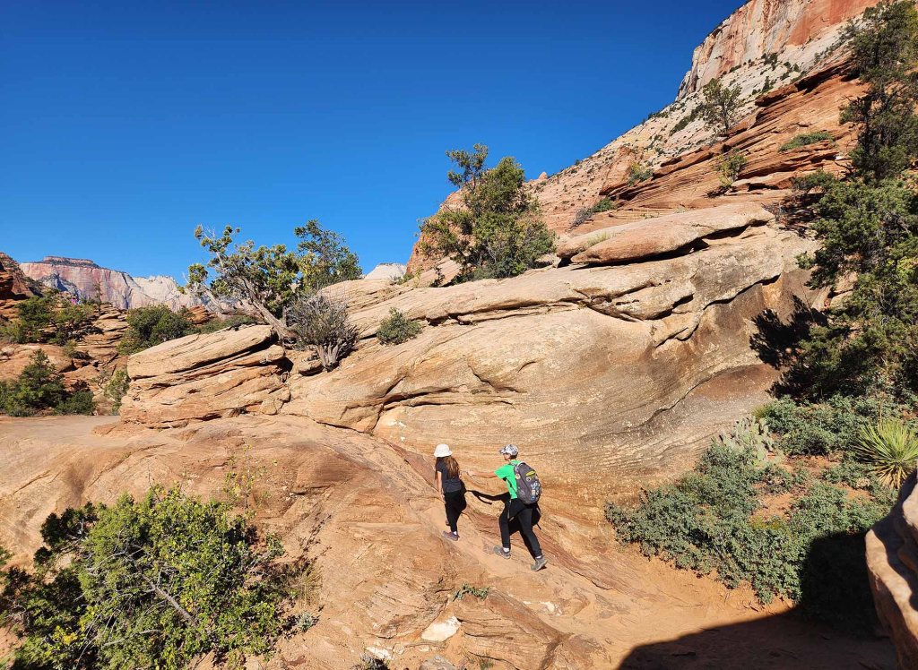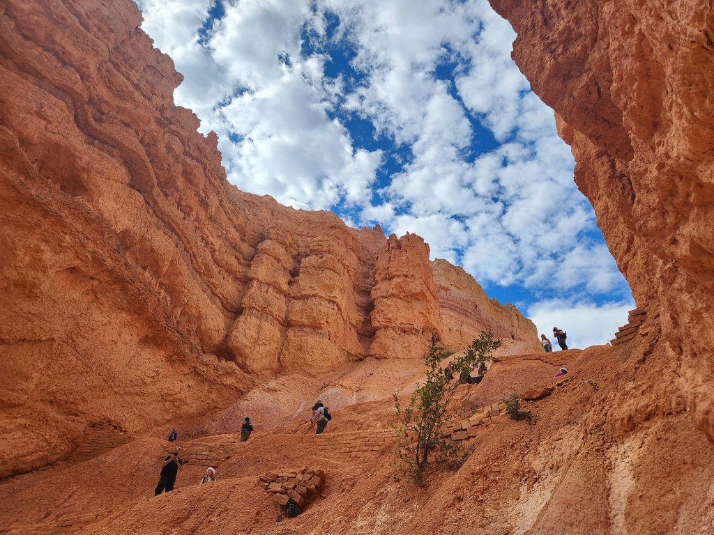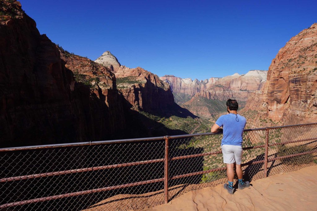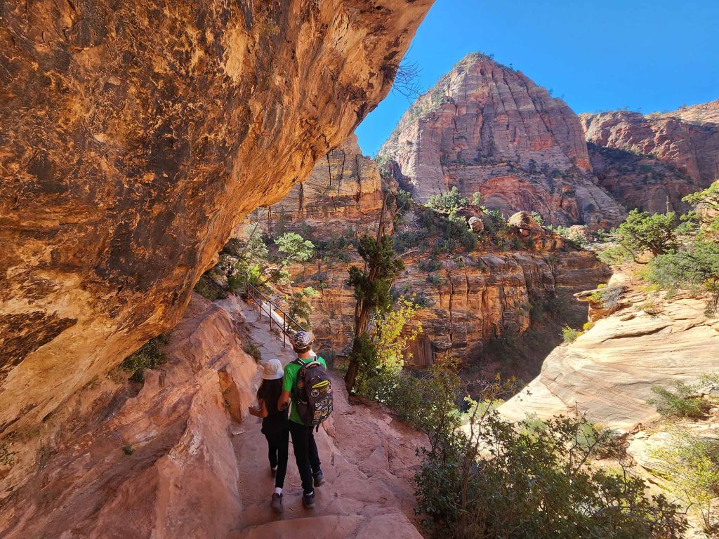 Zanim wjedziemy do parku, odstajemy „swoje” w długiej kolejce …. Rocznie park ten odwiedza 5 milionów turystów, co wiąże się oczywiście z przeogromnymi korkami, brakiem parkingów i tłumami na szlakach. My dzisiaj chcemy jedynie przejść jeden krótki szlak – Canyon Overlook Trail (długość 1 mila). Jadąc od wschodu nie znajdujemy jednak ani jednego wolnego miejsca, żeby zaparkować, a parking położony przy wjeździe do tunelu (po lewej stronie) jest niedostępny dla samochodów jadących na zachód (zakaz skrętu). Przejeżdżamy więc tunel i zawracamy, stojąc znowu w długiej kolejce. (ruch w tunelu odbywa się wahadłowo). Znajdujemy jakimś cudem 1 wolną miejscówkę na parkingu skąd wychodzi szlak. Wchodzimy po stromych schodkach i zaczynamy wędrówkę …