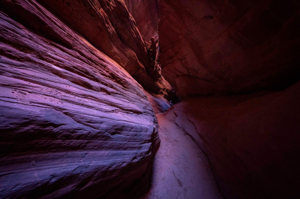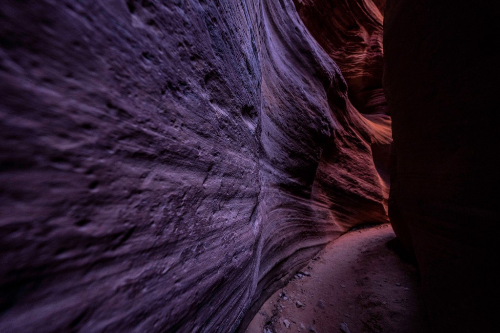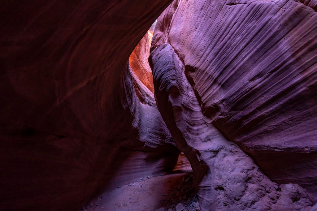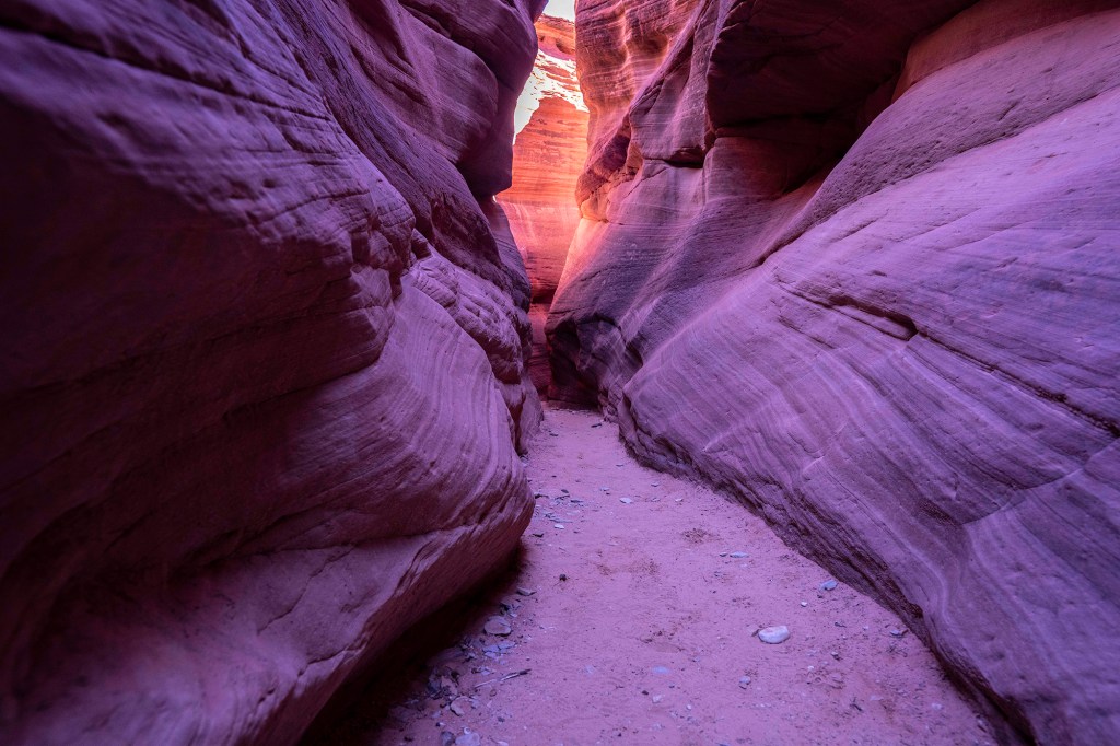 Schodzimy w dół i dalej wędrujemy suchym korytem rzeki (dry wash). Skręcamy w prawo (na zachód) i idąc po piasku dochodzimy do Pink Canyon (Różowego Kanionu), który jest krótkim kanionem szczelinowym (slot canyon) ze ścianami w żywych pastelowych kolorach.