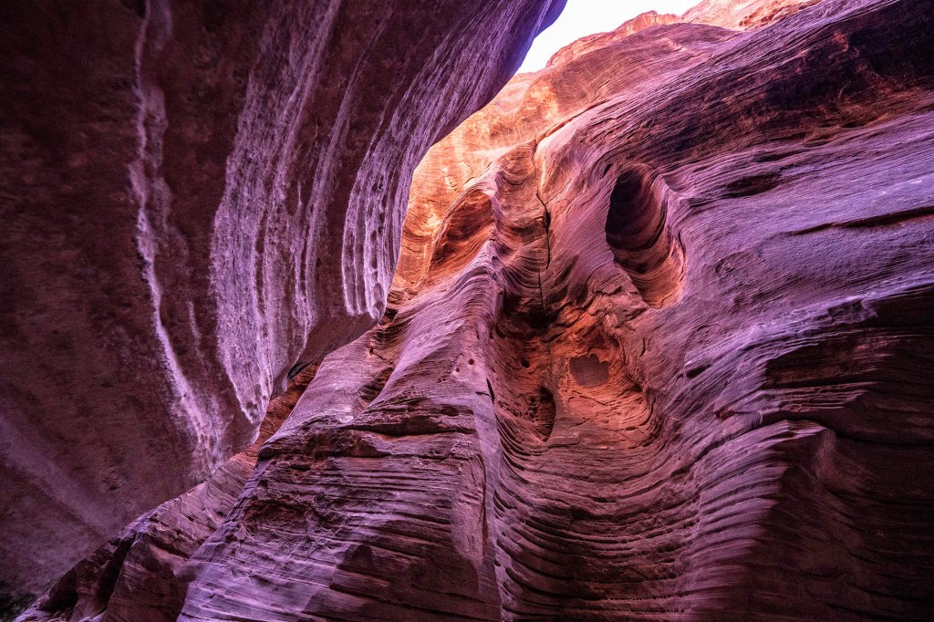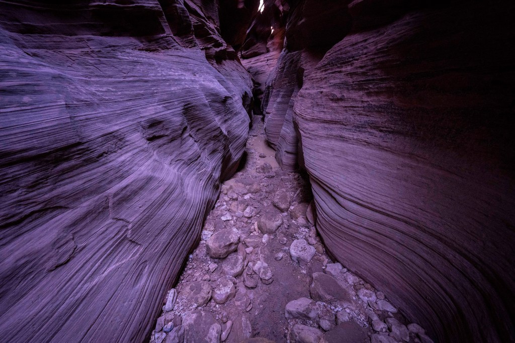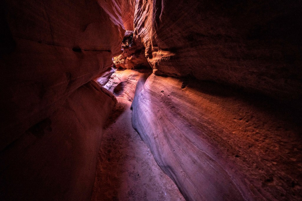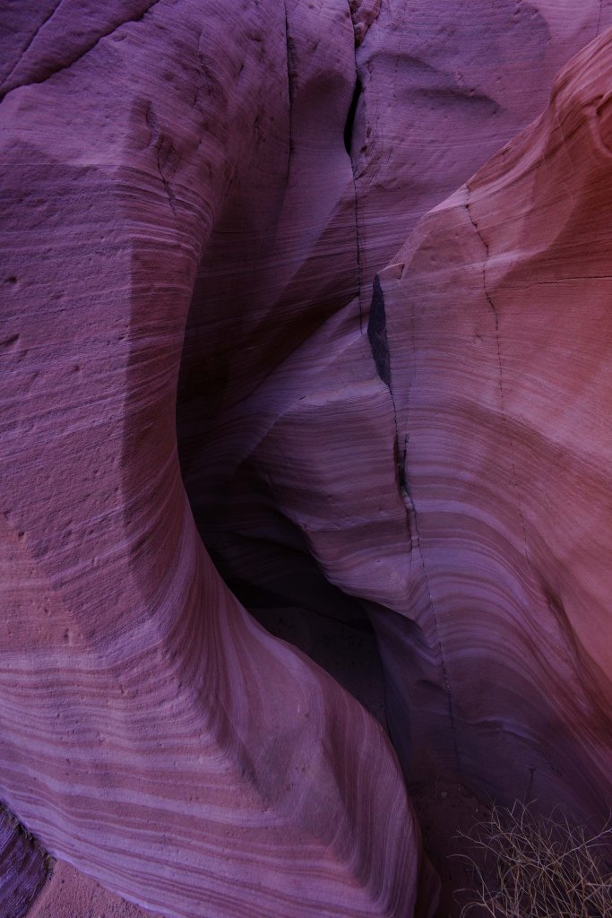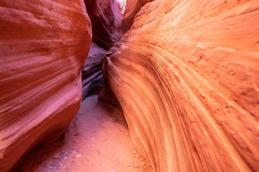 Schodzimy w dół i dalej wędrujemy suchym korytem rzeki (dry wash). Skręcamy w prawo (na zachód) i idąc po piasku dochodzimy do Pink Canyon (Różowego Kanionu), który jest krótkim kanionem szczelinowym (slot canyon) ze ścianami w żywych pastelowych kolorach.
