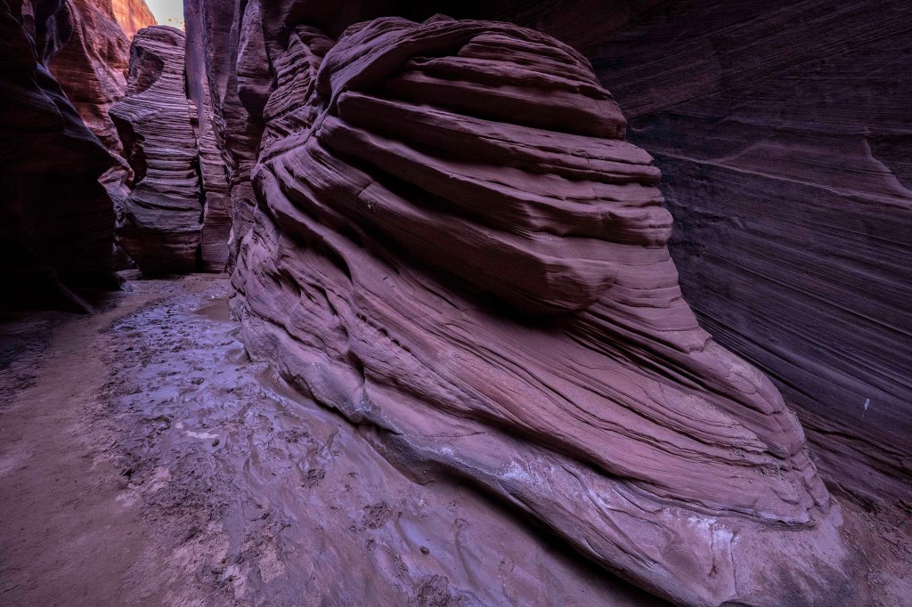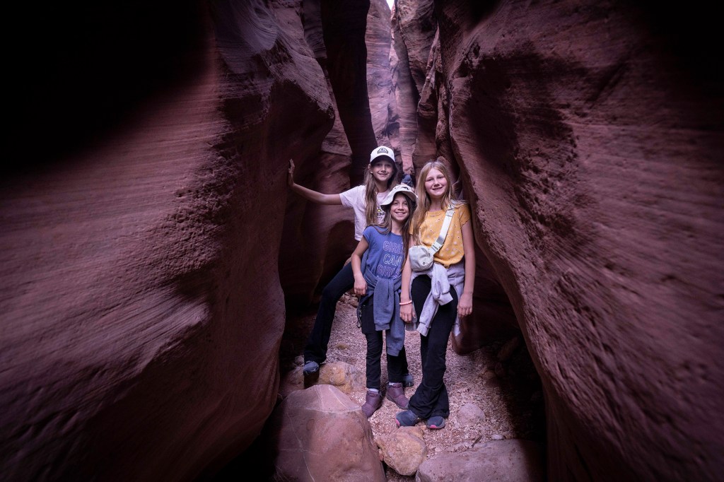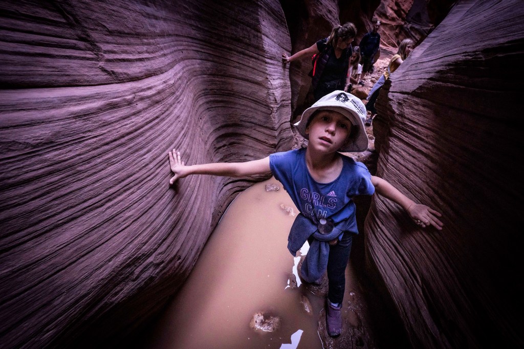 Kiedy kałuże stają się coraz głębsze postanawiamy zawrócić i przejść się również kawałek lewą odnogą Buckskin Gulch, która wydaje się nam trochę mniej spektakularna. Tu dzieci znajdują węża odpoczywającego pomiędzy skałami.