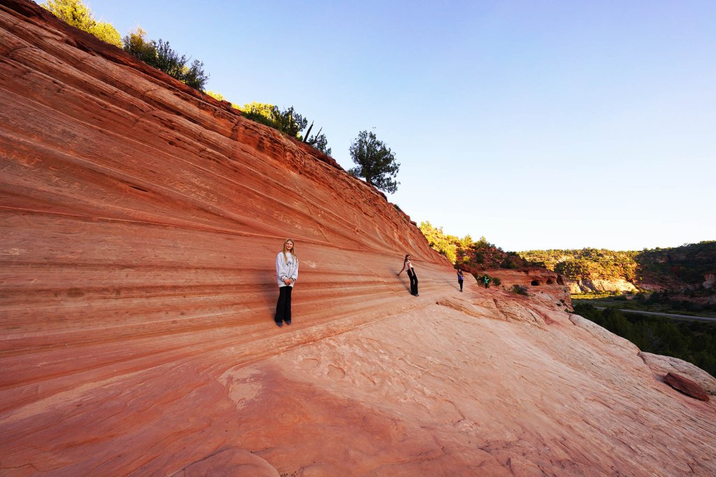Skały mienią się gamą ciepłych czerwieni, chłodnych brązów i gorących pomarańczy w „pomarszczonym” i karbowanym piaskowcu.