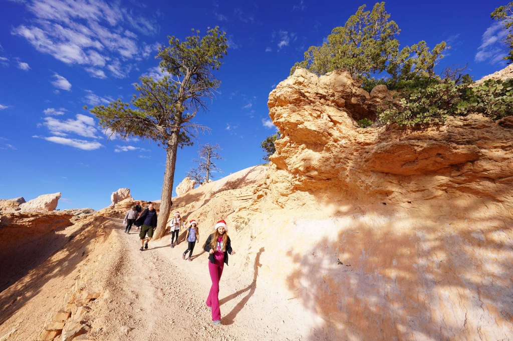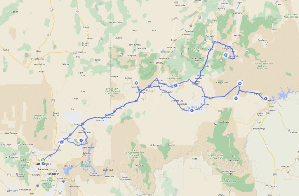 TRASA: Las Vegas – UTAH: (Snow Canyon State Park (Jenny’s canyon trail, Pioneer Names trail, Petrified Dunes trail, Butterfly, Lava Flow Overlook), ARIZONA: (Pipe Spring National Monument), UTAH: Kanab, Grand Staircase-Escalante National Monument: Paria Road, Red Canyon Peek a boo, Little Hollywood Museum, Grand Staircase-Escalante National Monument: Cat stair Canyon trail, Nautilus trail, Lake Powell – Lone Rock Beach, Grand Staircase-Escalante National Monument: Toadstool trail, Paria Canyon Vermilion Cliffs National Monument: Buckskin Gulch Wire pass trail; Sand Caves trail, Bryce Canyon National Park (Navajo Loop and Queens Garden Trail + Peekaboo Loop Trail); Belly of the dragon trial, Zion National Park (Zion Canyon Overlook trail), St. George – Red Hills Desert Garden; Nevada: Valley of the Fire State Park (Elephant Rock trail, Fire Wave trail + Pink Cayon trail + Fire Cayon Road, Rainbow Vista Trail, Petrified Log trail), Las Vegas.