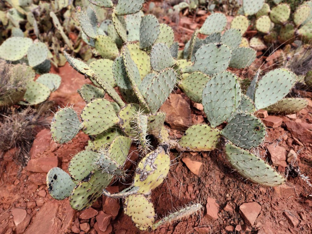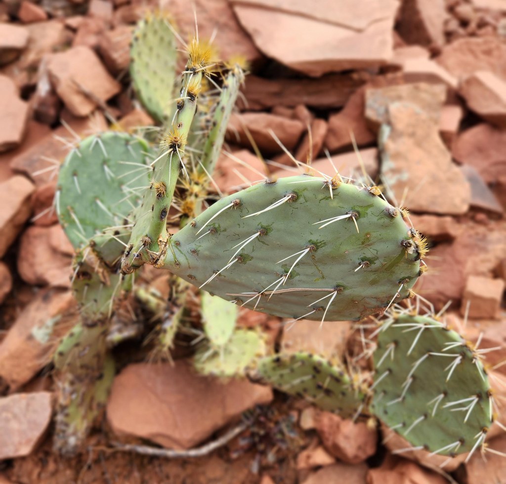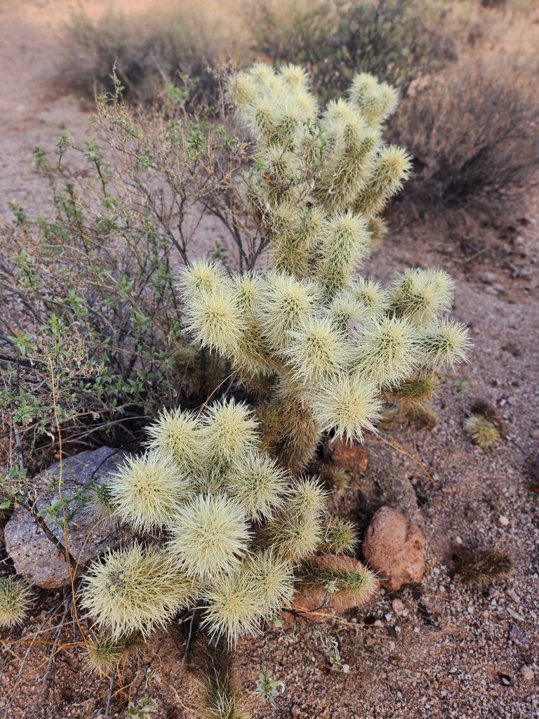 Innym ciekawym gatunkiem kaktusów jaki spotykamy na szlaku jest tzw. „skacząca cholla„. Nazwa pochodzi od łatwości, z jaką kulki kaktusowe odrywają się od rośliny. Wystarczy delikatny dotyk i momentalnie otrzymujemy przysłowiowego rzepa……Kolce cholli zakończone są tzw. „kotwicami”, które po wbiciu w skórę, poza ogromnym bólem są bardzo trudne do usunięcia……
