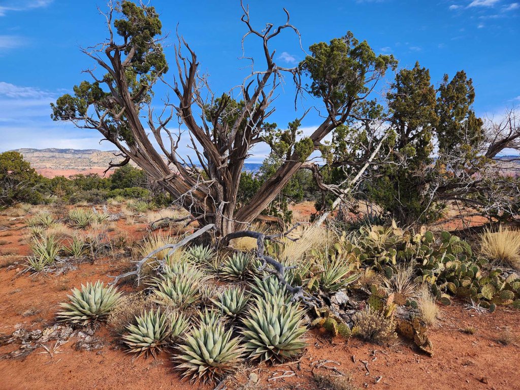 Dochodzimy do wielkiego jałowca – aligator juniper tree, służacego jako drogowskaz do odejścia od głównego szlaku Boynton trail w kierunku jaskini Subway. Drzewo to znajduje się po naszej lewej stronie (wędrując na północ) i jak tylko je miniemy musimy odbić w prawo (nie ma żadnego kierunkowskazu). (jest to mniej więcej 2 mile od wyjścia na szlak). (Chodzi tędy tak dużo ludzi, że na pewno ktoś nam pomoże wskazać odpowiedni kierunek, jeśli będziemy mieli wątpliwości). Jeśli pójdziemy za daleko to od razu zorientujemy się, że coś jest nie tak… roślinność drastycznie się zmieni i otoczeni zostaniemy bardzo wysokimi sosnami… Jeszcze przed dojściem do charakterystycznego aligator tree wchodzimy w cień rzucany przez pasmo górskie (należące do Red Rock Secret Muntain Wilderness), co oznacza znacznie niższą temperaturę otoczenia i konieczność założenia ciepłych polarów.