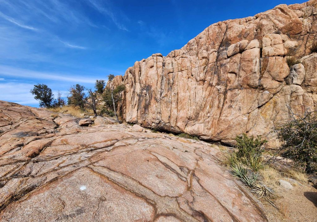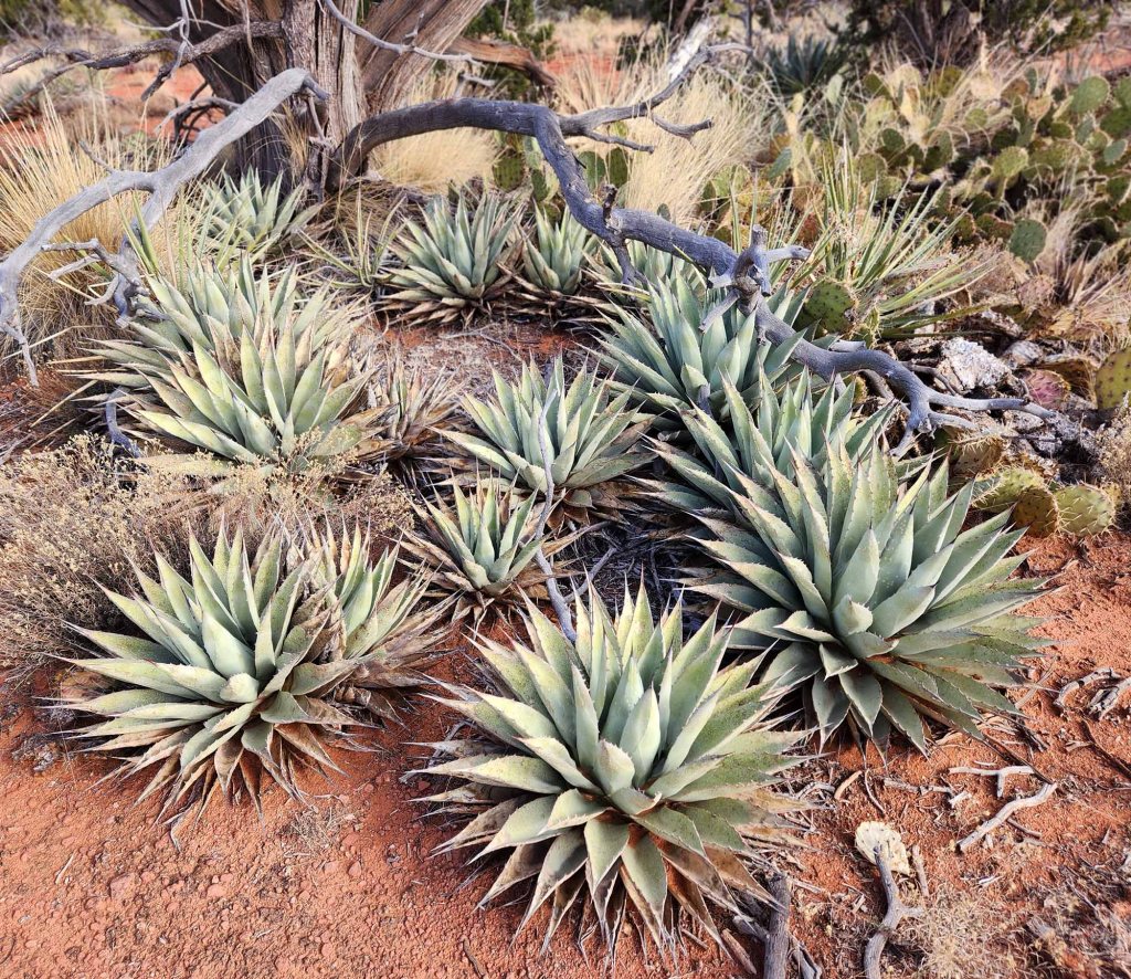 Po skręcie w prawo ścieżka znacznie się zwęża i po przejściu suchego koryta rzecznego – dry wash – wznosimy się już stromo do góry. Idziemy teraz głównie w otoczeniu kaktusów prickly pear, juk i agaw.