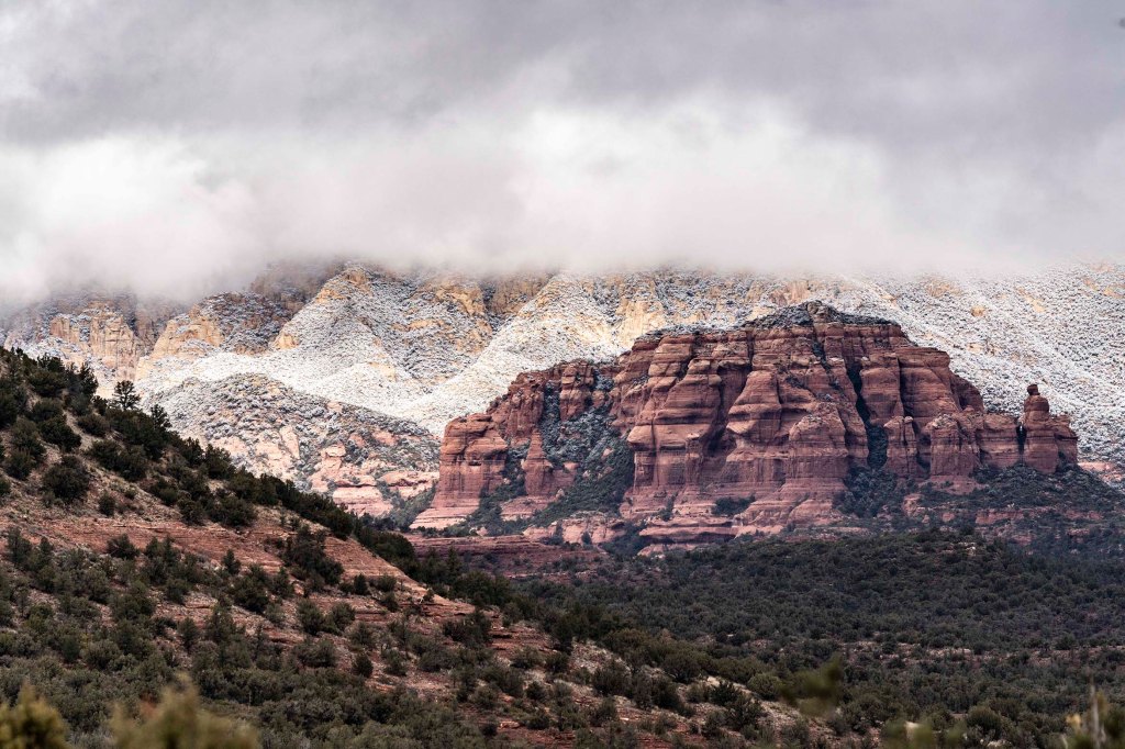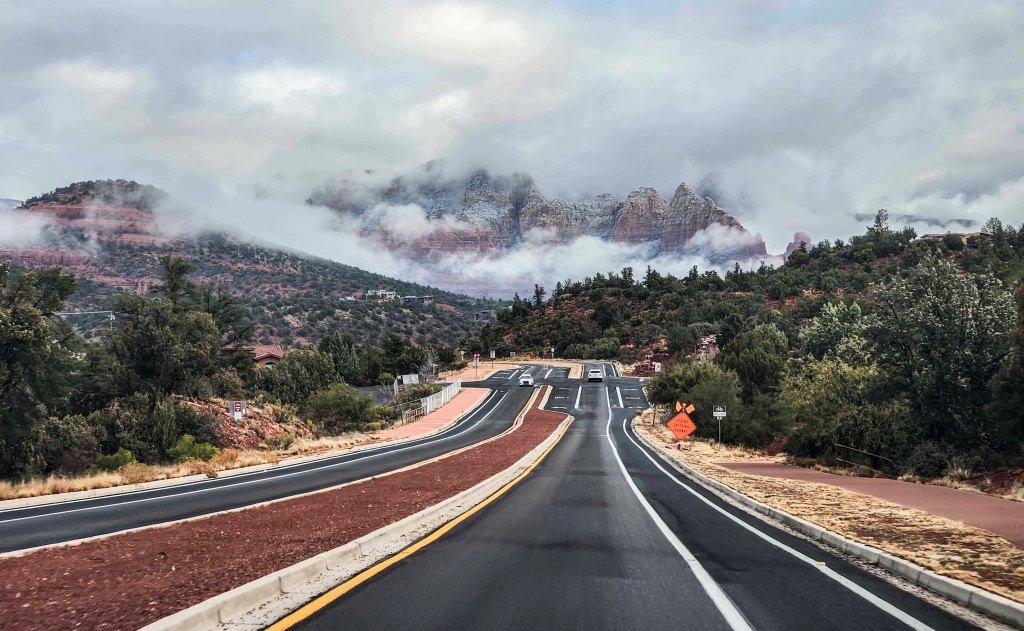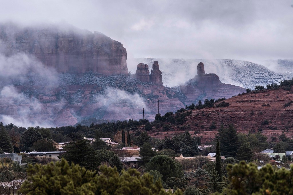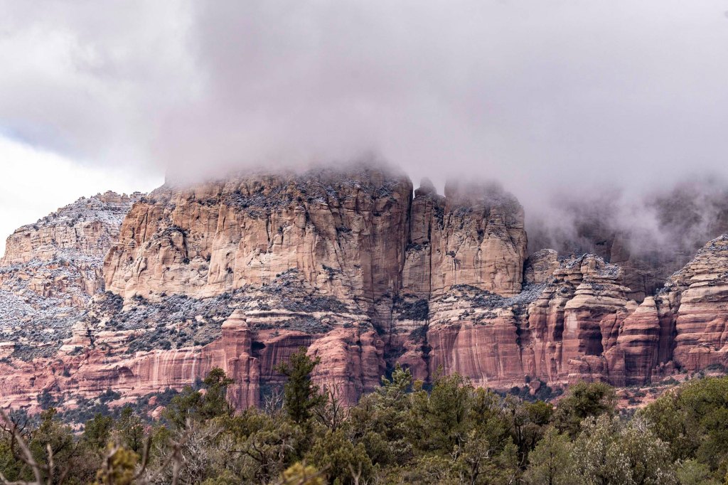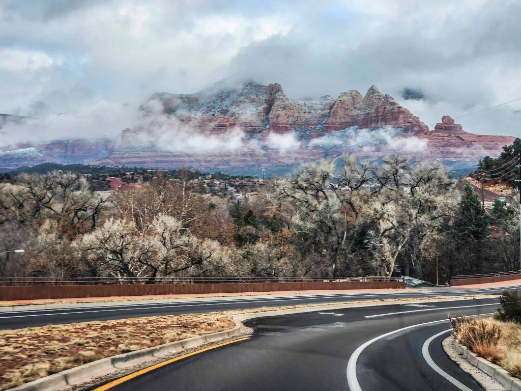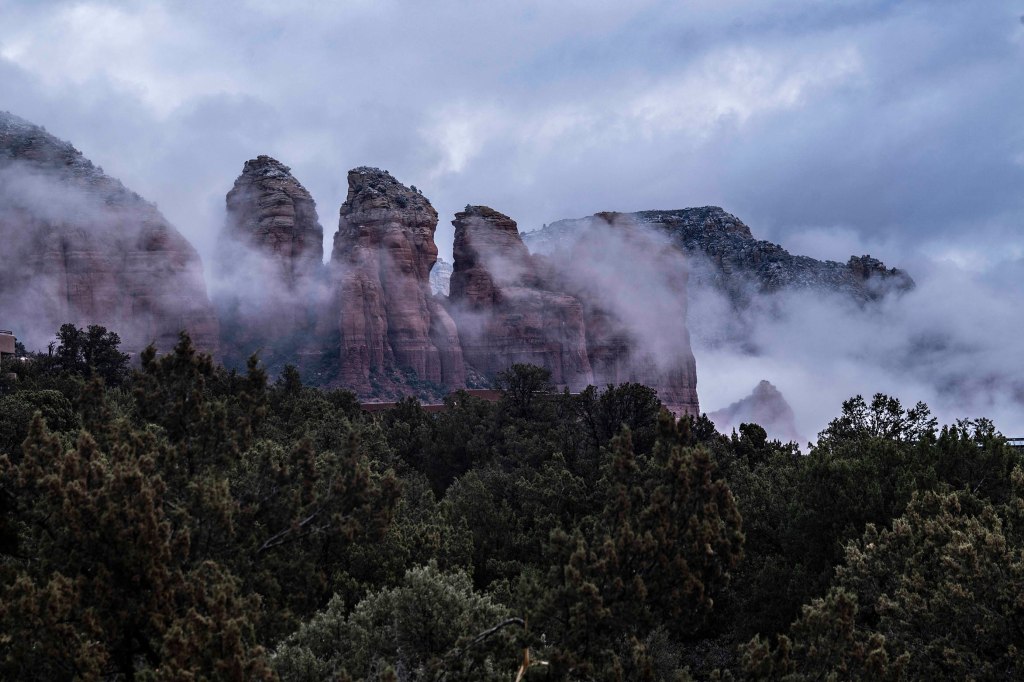 O świcie jedziemy w stronę centrum Sedony, mijając okoliczne góry zatopione we mgle i gęstych chmurach.
