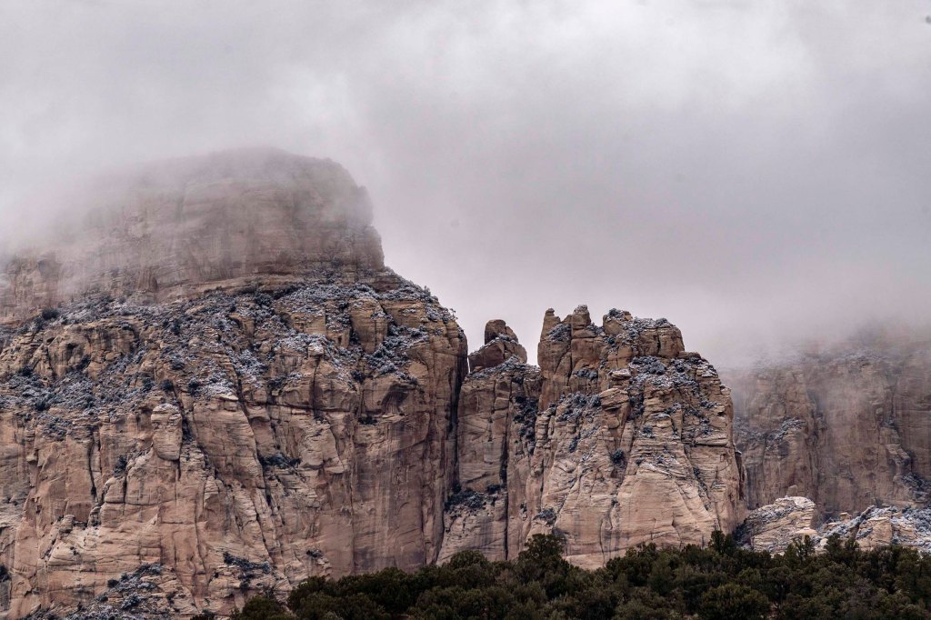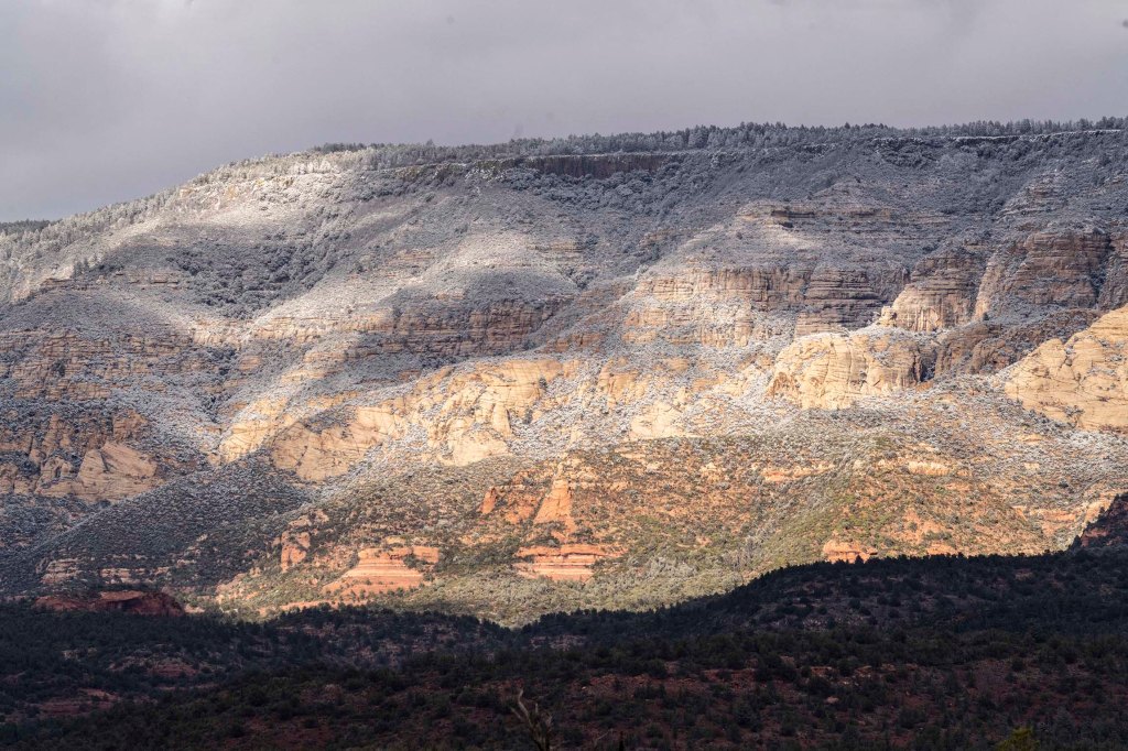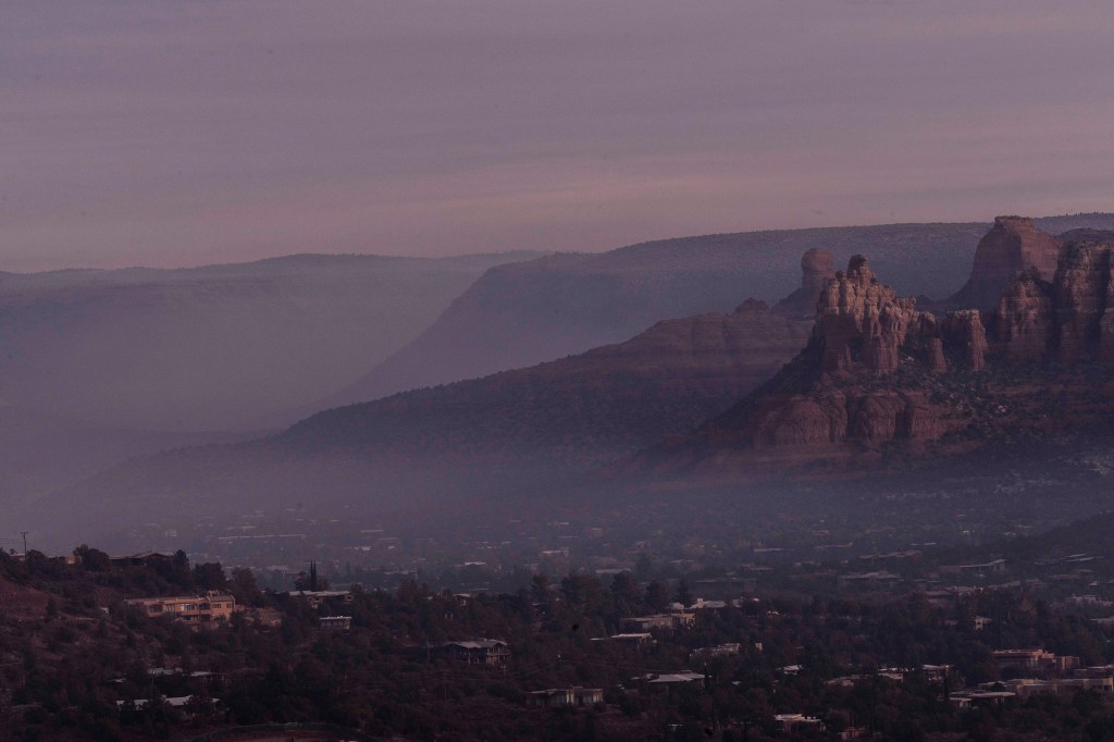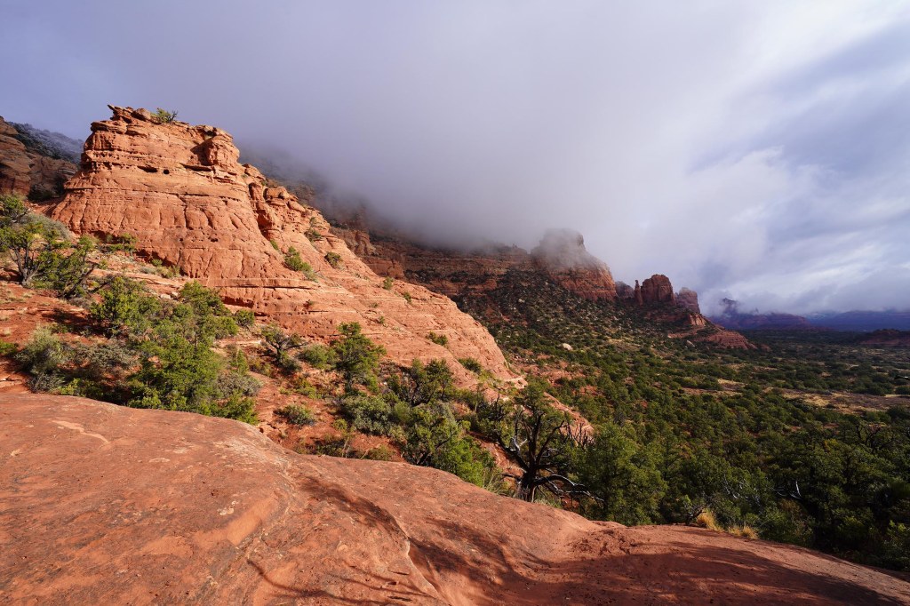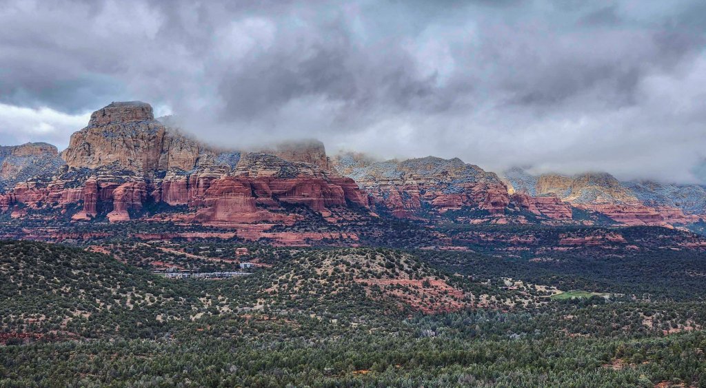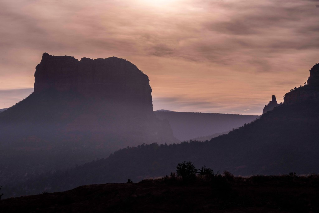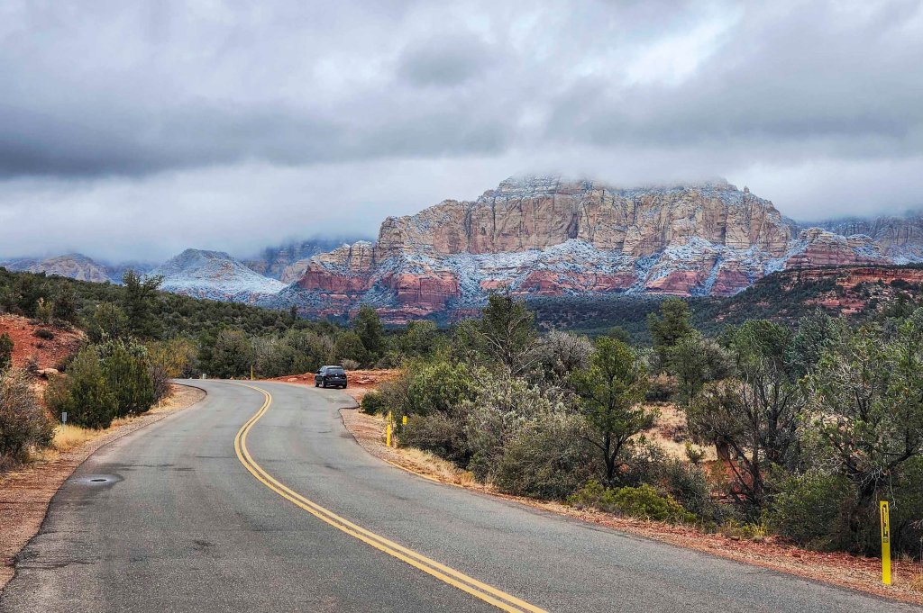 O świcie jedziemy w stronę centrum Sedony, mijając okoliczne góry zatopione we mgle i gęstych chmurach.