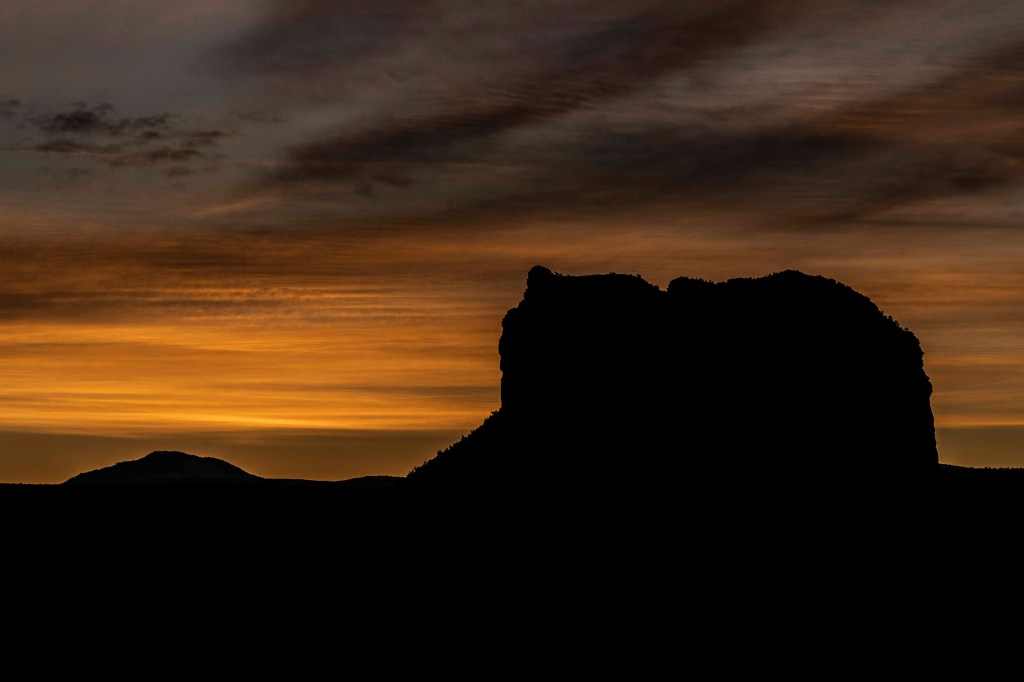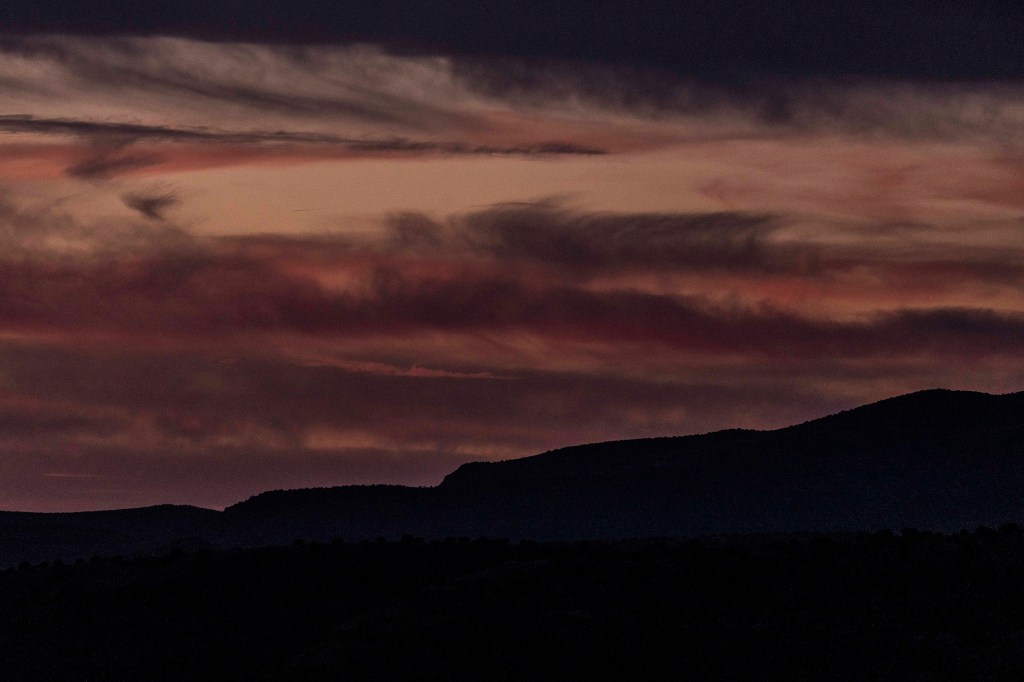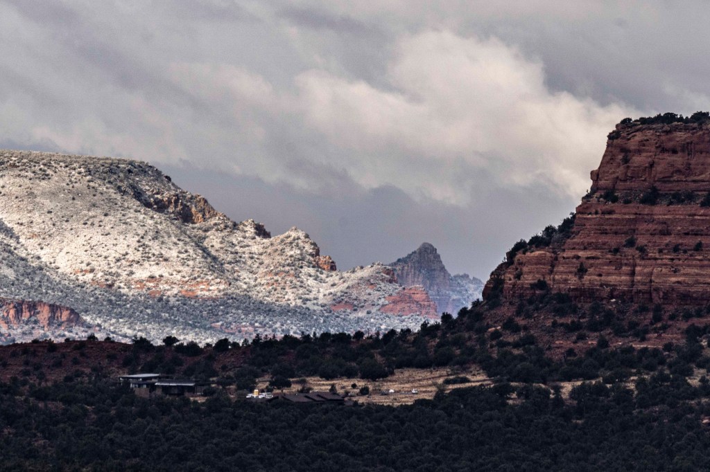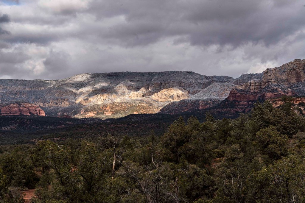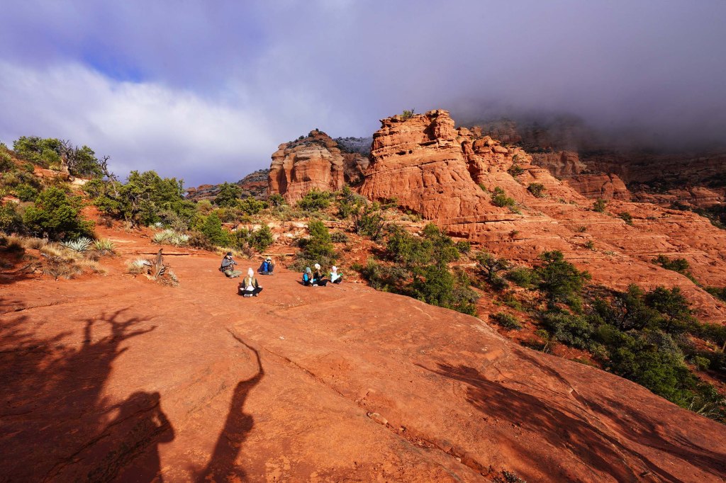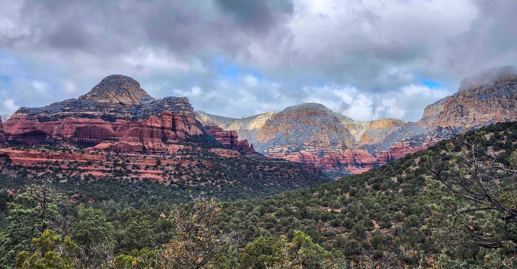 O świcie jedziemy w stronę centrum Sedony, mijając okoliczne góry zatopione we mgle i gęstych chmurach.