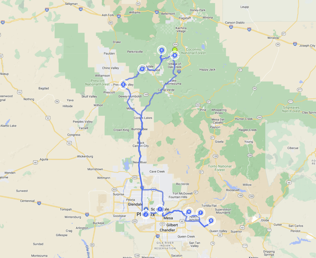 TRASA: Phoenix, Sedona (Subway trail, Cathedral Rock trail via Baldwin trail, Devils Bridge trail via Mescal trail, Palatki Heritage Site, Doe Mountain trail, Birthing Cave trail, Mescal Mountain: Long Canyon, Deadman Pass, Mescal Loop trail, Lower Chimney to Chimney Rock loop trail, Amitabha Stupa, Cathedral Rock trail, Jerome, Prescott – (Granite Garden trail), Phoenix: (Dutchman state park – Treasure loop), Hieroglyphic trail, Shaka Cave via Carney Springs trail, Usery Mountain Regional Park: Wind Cave trial.