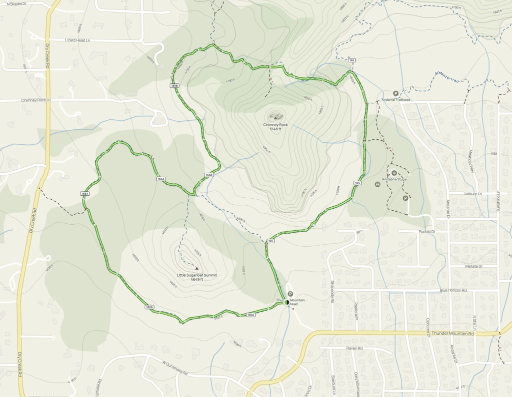 Zaczynamy od szlaku Lower Chimney Rock to Chimey Rock loop (długość 2.3 mile+zejście do świątyni buddyjskiej Amitabha stupa razem: 2,5 mili, zmiana elewacji 377 ft).