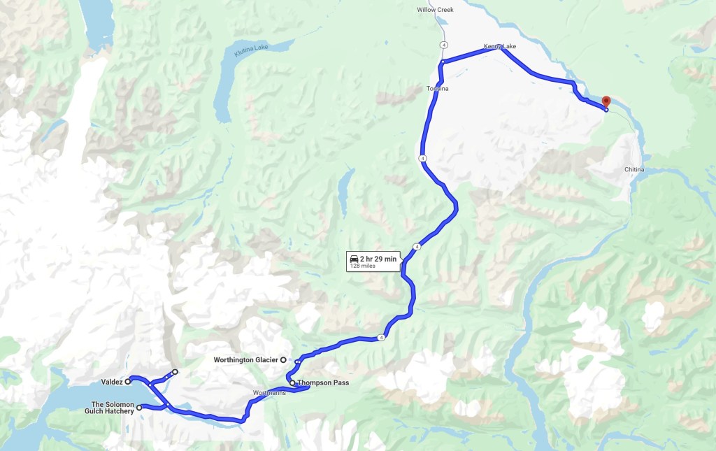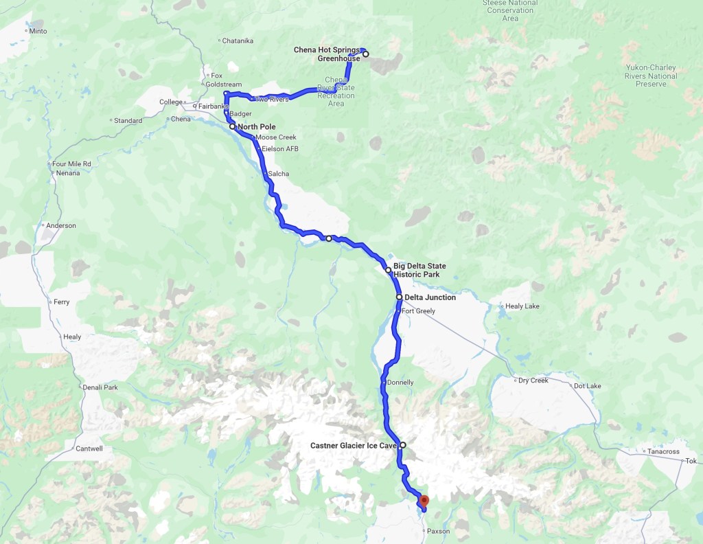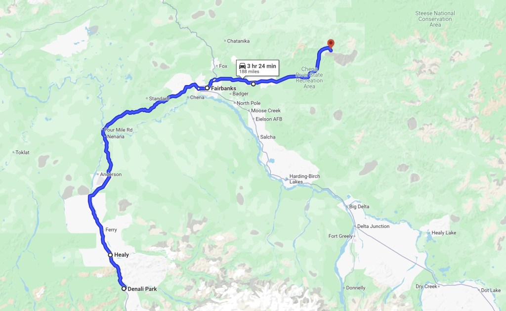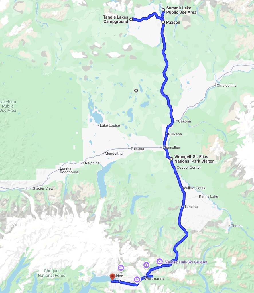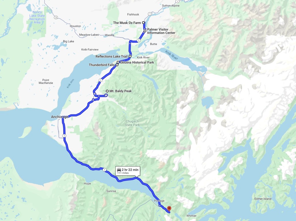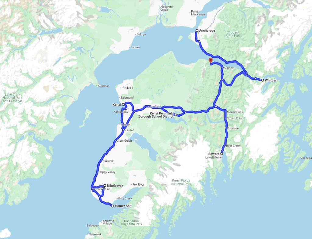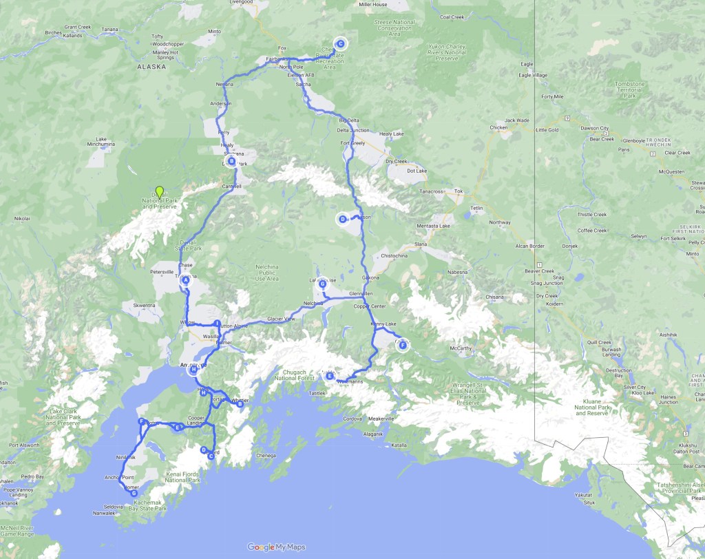 TRASA: Anchorage – Anchorage, Kenai peninsula (Whittier, Seward (Resurrection Bay- Kenai Fjords National Park Cruise), Kenai Fjords National Park (Harding Icefield trail), Tern Lake, Soldotna, Skilak Wildlife Recreation Area, Kenai, Ninilchik, Nikolaevsk, Homer, Hope, Alaska Wildlife Conservation Center), Palmer, Reed lake trail (Hatcher Pass), Independence Mine State Park, Talkeetna, Denali National Park (Savage Alpine trail, sled dog demonstration), Fairbanks, Chena Hot Springs, North Pole, Tangle lake ridge trail, Delta Junction, Castner glacier ice cave trail, , Valdez, Valdez glacier lake, Thompson pass trail, Worthington glacier trail, Chitina, Lake Louise, Matanuska glacier, Lion’s Head trail, Anchorage, Reflections lake trail, Eklutna, Mt Baldy trail, Whittier, Byron Glacier trail, Anchorage (Alaska Public Lands Information Center)